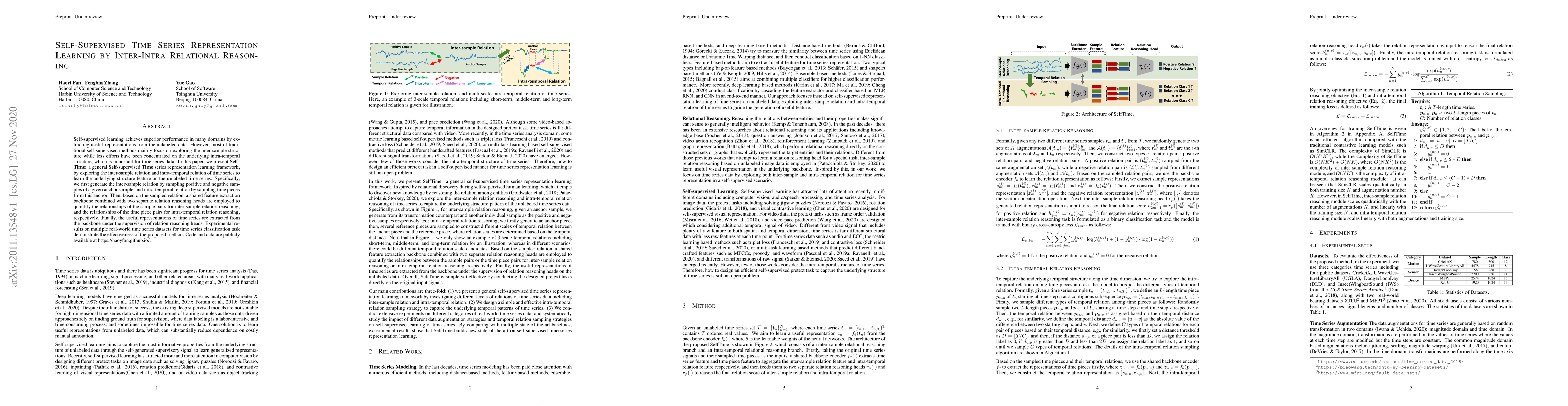 This paper introduces SelfTime, a self-supervised framework for time series representation learning that leverages both inter-sample and intra-temporal relations to extract meaningful features from unlabeled data. The method employs relation reasoning heads to quantify inter-sample and intra-temporal relationships, demonstrating improved performance on time series classification tasks.