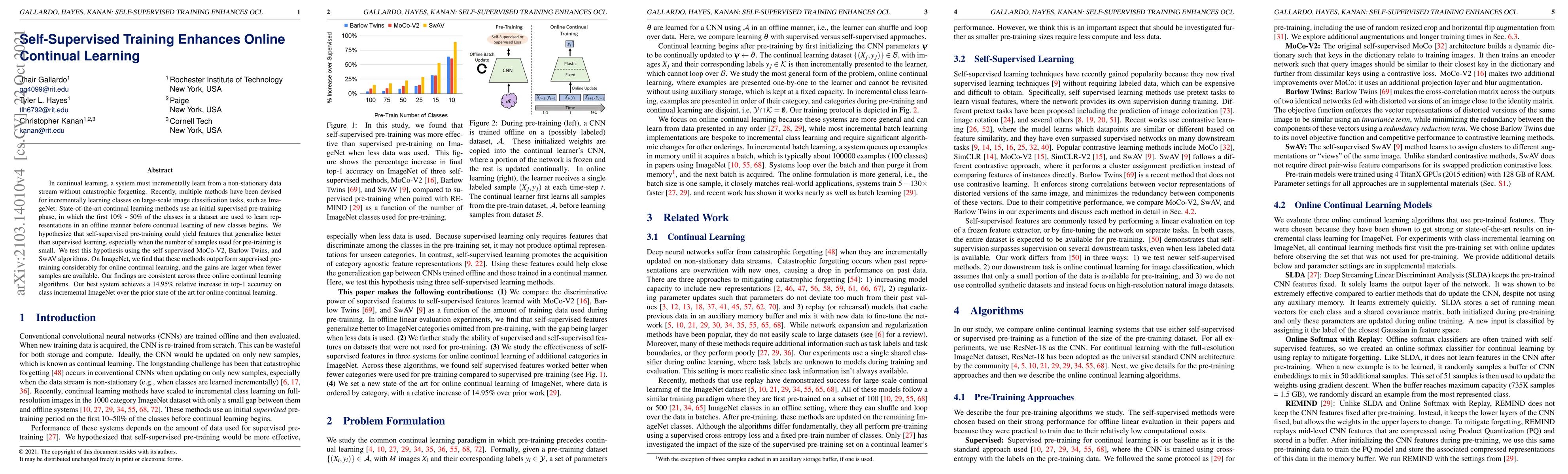 Self-supervised training using MoCo-V2, Barlow Twins, and SwAV algorithms significantly outperforms supervised pre-training for online continual learning on ImageNet, especially when sample sizes are small, achieving a 14.95% relative improvement in top-1 accuracy.