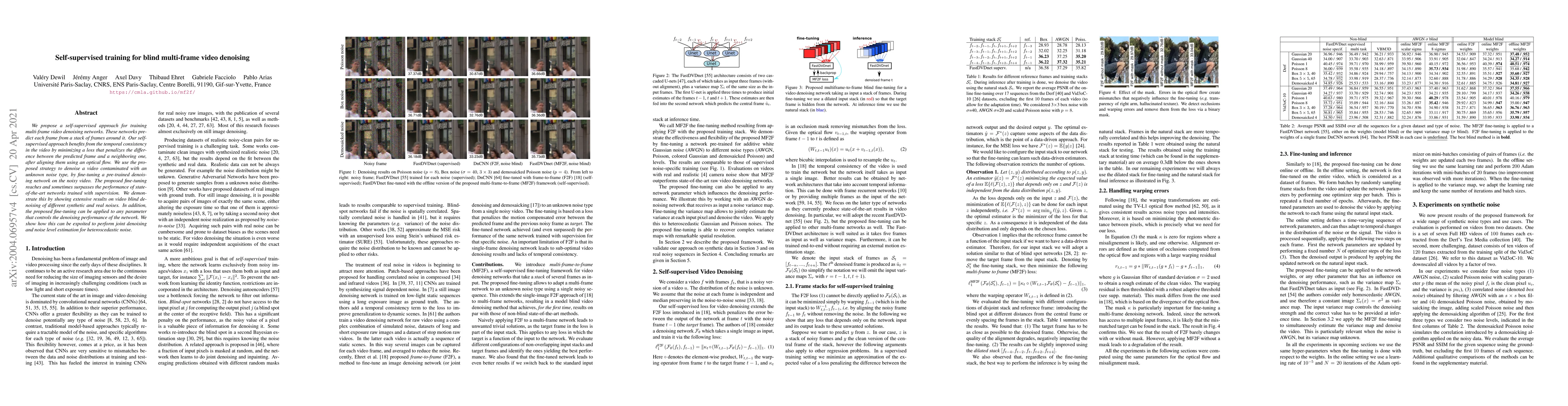 This paper proposes a self-supervised method for training multi-frame video denoising networks that leverages temporal consistency and optical flow alignment. The approach enables fine-tuning of pre-trained networks to adapt to new unknown noise types, achieving performance comparable to supervised state-of-the-art networks.