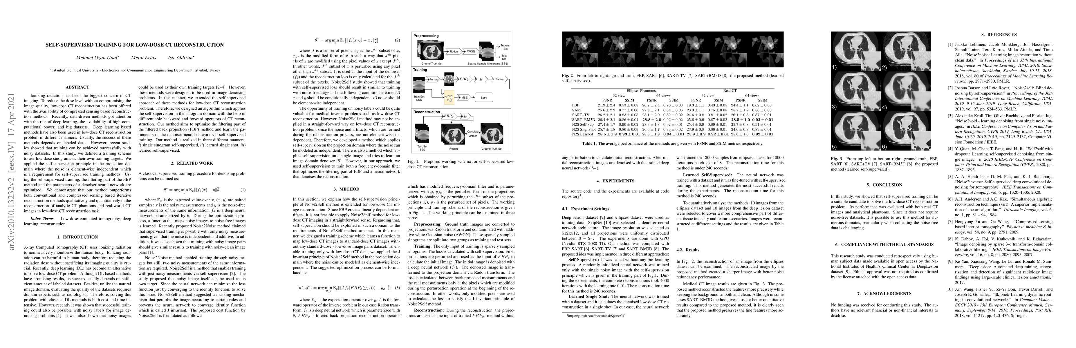 This paper proposes a self-supervised training method for low-dose CT reconstruction using low-dose sinograms as their own training targets, optimizing both the filtering part of the FBP method and a denoiser neural network. The method outperforms conventional and compressed sensing-based reconstruction techniques in both qualitative and quantitative assessments.