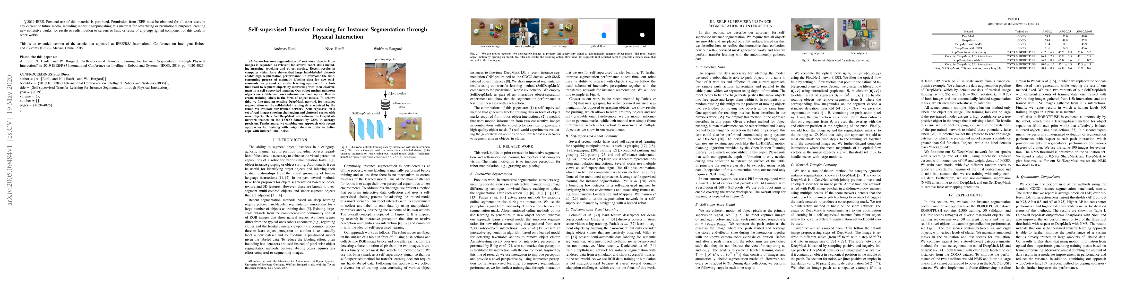 This paper proposes a self-supervised learning method for instance segmentation using physical interaction, where a robot segments unknown objects by pushing them and using optical flow to generate self-labeled training data. The fine-tuned DeepMask network (SelfDeepMask) outperforms the original model trained on COCO by 9.5% in average precision on real, cluttered scenes.
