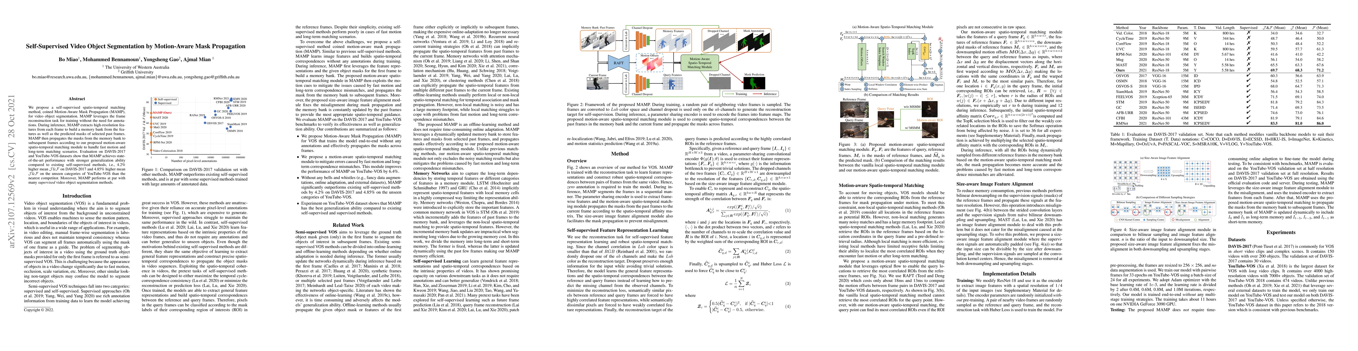 The paper introduces Motion-Aware Mask Propagation (MAMP), a self-supervised method for video object segmentation, which trains via frame reconstruction without annotations and achieves state-of-the-art performance on DAVIS-2017 and YouTube-VOS datasets. MAMP's motion-aware spatio-temporal matching module enhances generalization and matches objects across frames with fast motion.