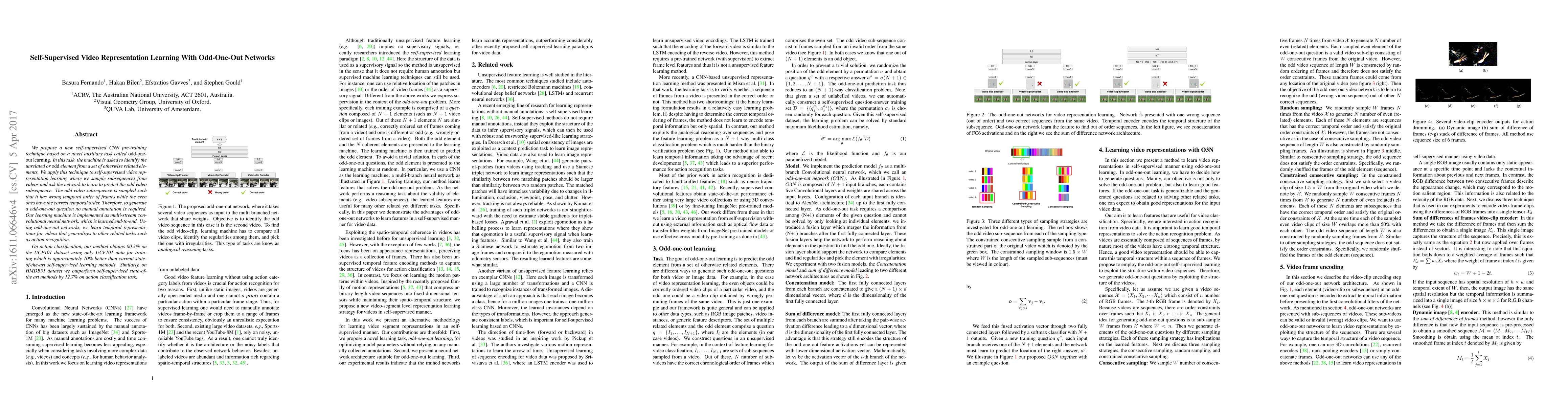 This paper introduces a self-supervised learning technique using "odd-one-out" networks to pre-train CNNs for video representation learning. The method identifies the incorrectly ordered video subsequence without manual annotations, achieving better results on action recognition tasks compared to current state-of-the-art methods.