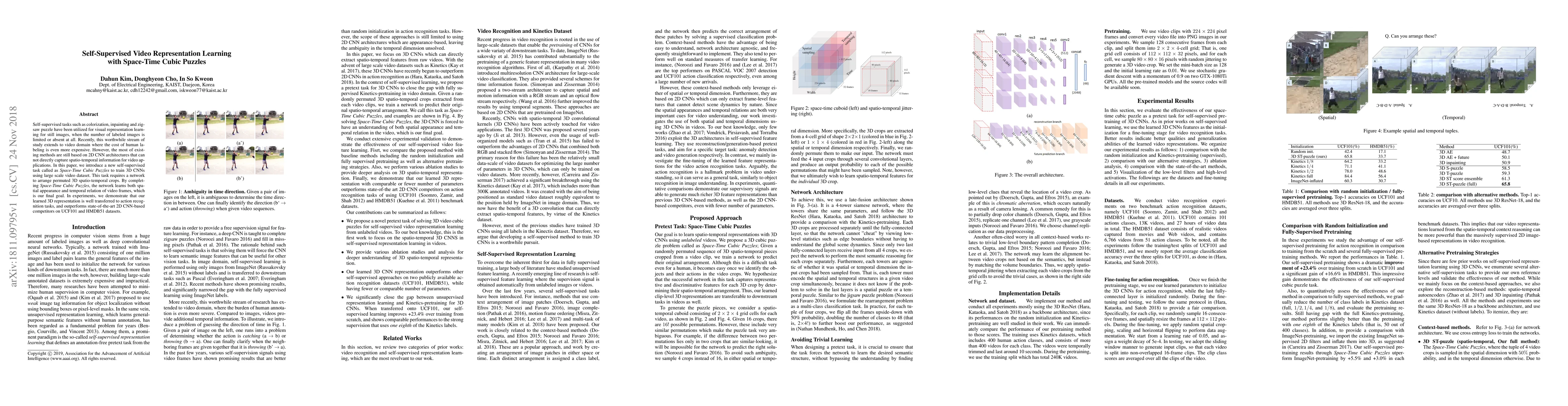 This paper proposes a self-supervised learning task called Space-Time Cubic Puzzles to train 3D CNNs for video representation learning, achieving better performance on action recognition tasks compared to 2D CNN-based methods. The task involves arranging permuted 3D spatio-temporal video crops, effectively learning spatial and temporal relations.