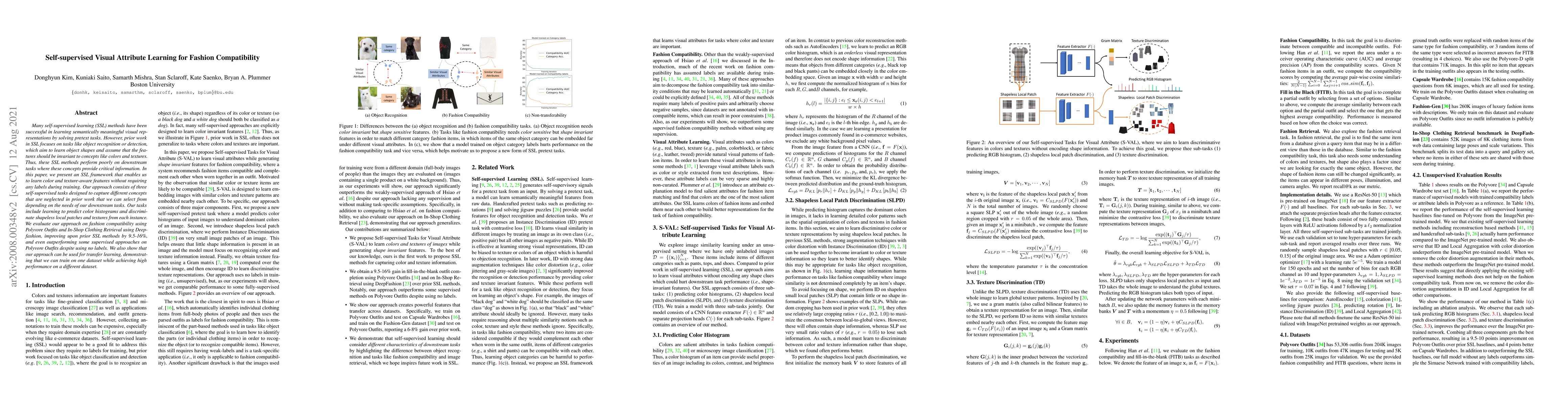 This paper presents a self-supervised learning framework that learns color and texture-aware features without labels, improving performance on fashion compatibility tasks such as Polyvore Outfits.