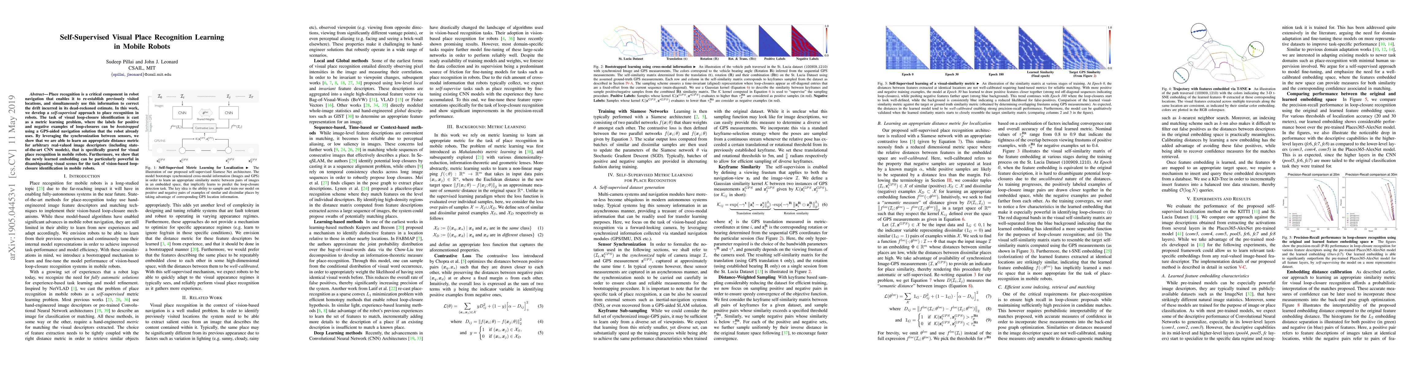 This paper presents a self-supervised method for visual place recognition in mobile robots, framing loop-closure identification as a metric learning problem. It leverages GPS data to bootstrap labels and learns a distance metric tailored for visual place recognition, demonstrating improved performance in disambiguating visual scenes.