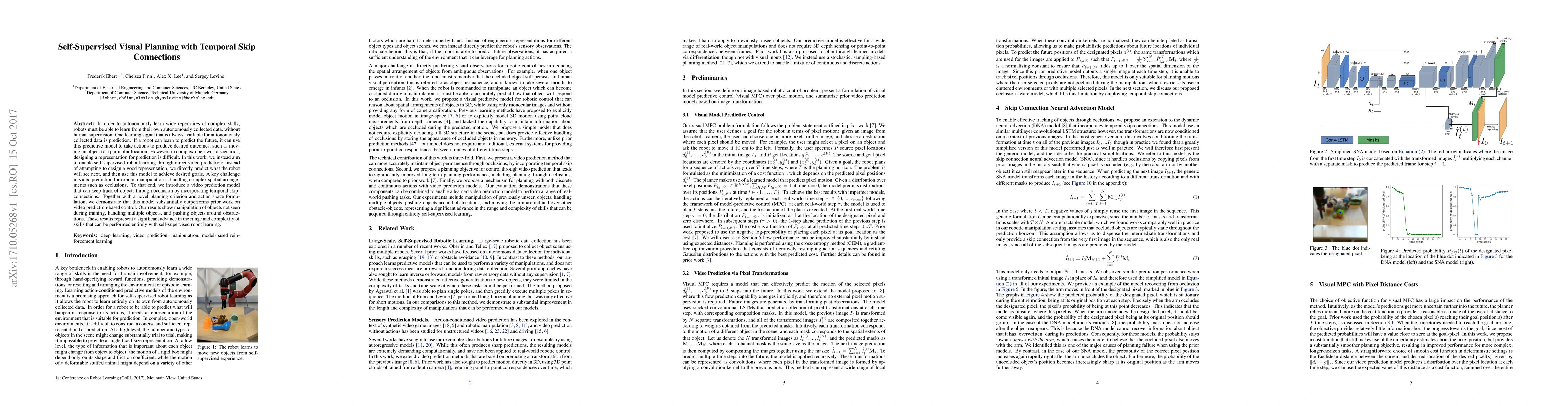 In order to autonomously learn wide repertoires of complex skills, robots must be able to learn from their own autonomously collected data, without human supervision. One learning signal that is always available for autonomously collected data is prediction: if a robot can learn to predict the future, it can use this predictive model to take actions to produce desired outcomes, such as moving an object to a particular location. However, in complex open-world scenarios, designing a representation for prediction is difficult. In this work, we instead aim to enable self-supervised robotic learning through direct video prediction: instead of attempting to design a good representation, we directly predict what the robot will see next, and then use this model to achieve desired goals. A key challenge in video prediction for robotic manipulation is handling complex spatial arrangements such as occlusions. To that end, we introduce a video prediction model that can keep track of objects through occlusion by incorporating temporal skip-connections. Together with a novel planning criterion and action space formulation, we demonstrate that this model substantially outperforms prior work on video prediction-based control. Our results show manipulation of objects not seen during training, handling multiple objects, and pushing objects around obstructions. These results represent a significant advance in the range and complexity of skills that can be performed entirely with self-supervised robotic learning.