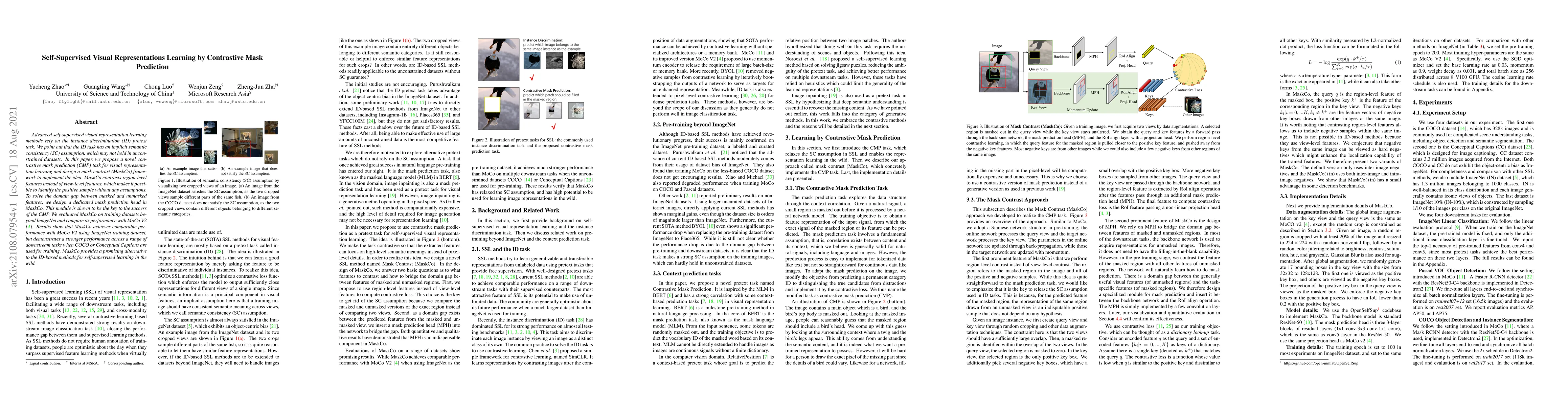 Advanced self-supervised visual representation learning methods rely on the instance discrimination (ID) pretext task. We point out that the ID task has an implicit semantic consistency (SC) assumption, which may not hold in unconstrained datasets. In this paper, we propose a novel contrastive mask prediction (CMP) task for visual representation learning and design a mask contrast (MaskCo) framework to implement the idea. MaskCo contrasts region-level features instead of view-level features, which makes it possible to identify the positive sample without any assumptions. To solve the domain gap between masked and unmasked features, we design a dedicated mask prediction head in MaskCo. This module is shown to be the key to the success of the CMP. We evaluated MaskCo on training datasets beyond ImageNet and compare its performance with MoCo V2. Results show that MaskCo achieves comparable performance with MoCo V2 using ImageNet training dataset, but demonstrates a stronger performance across a range of downstream tasks when COCO or Conceptual Captions are used for training. MaskCo provides a promising alternative to the ID-based methods for self-supervised learning in the wild.