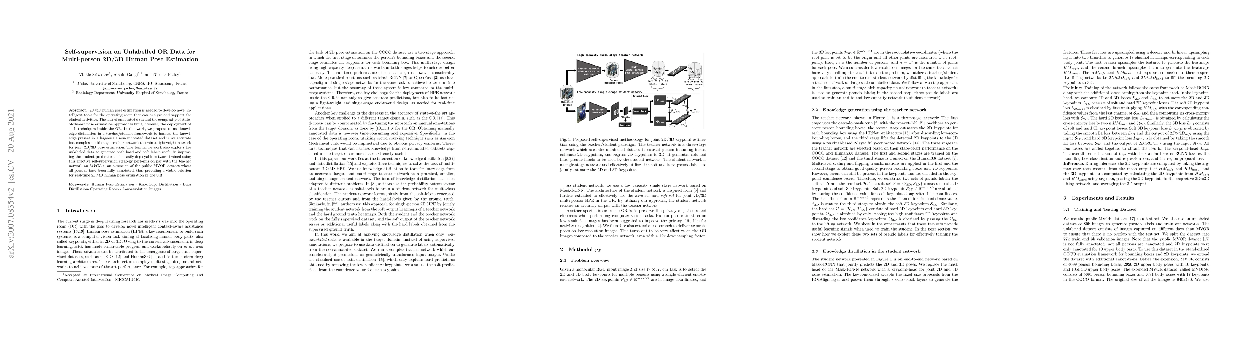 2D/3D human pose estimation is needed to develop novel intelligent tools for the operating room that can analyze and support the clinical activities. The lack of annotated data and the complexity of state-of-the-art pose estimation approaches limit, however, the deployment of such techniques inside the OR. In this work, we propose to use knowledge distillation in a teacher/student framework to harness the knowledge present in a large-scale non-annotated dataset and in an accurate but complex multi-stage teacher network to train a lightweight network for joint 2D/3D pose estimation. The teacher network also exploits the unlabeled data to generate both hard and soft labels useful in improving the student predictions. The easily deployable network trained using this effective self-supervision strategy performs on par with the teacher network on \emph{MVOR+}, an extension of the public MVOR dataset where all persons have been fully annotated, thus providing a viable solution for real-time 2D/3D human pose estimation in the OR.