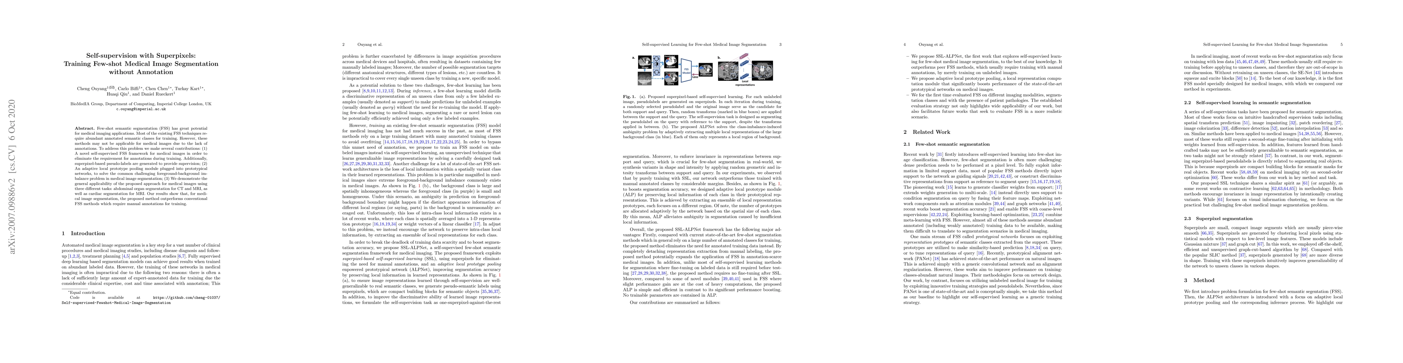 This paper proposes a self-supervised framework for few-shot medical image segmentation that eliminates the need for annotations by generating superpixel-based pseudo-labels. It introduces an adaptive local prototype pooling module to address foreground-background imbalance, demonstrating superior performance over annotated-based methods in abdominal and cardiac segmentation tasks.