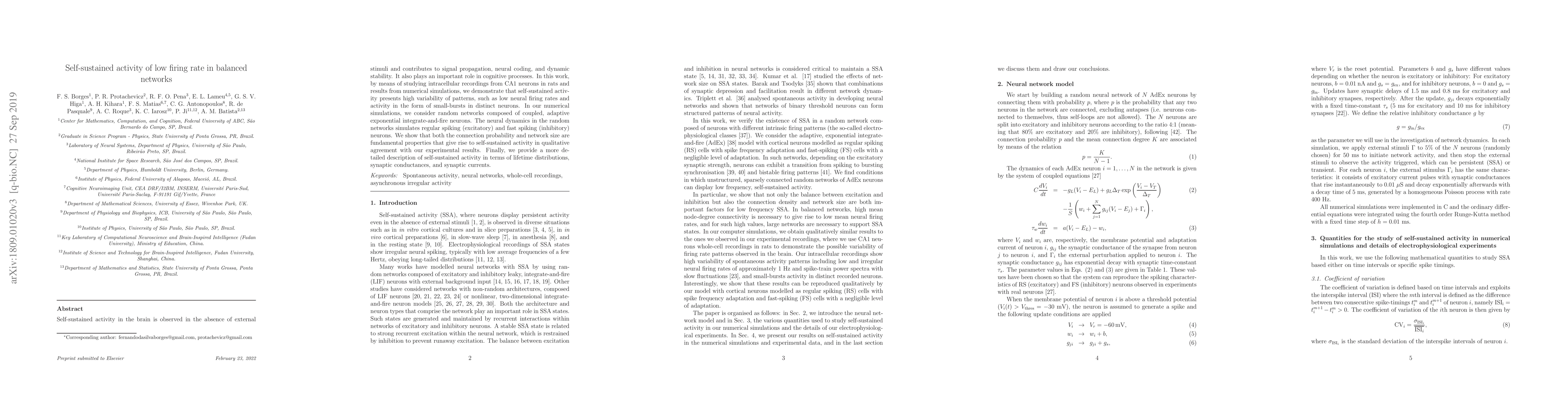 Self-sustained activity in the brain is observed in the absence of external stimuli and contributes to signal propagation, neural coding, and dynamic stability. It also plays an important role in cognitive processes. In this work, by means of studying intracellular recordings from CA1 neurons in rats and results from numerical simulations, we demonstrate that self-sustained activity presents high variability of patterns, such as low neural firing rates and activity in the form of small-bursts in distinct neurons. In our numerical simulations, we consider random networks composed of coupled, adaptive exponential integrate-and-fire neurons. The neural dynamics in the random networks simulate regular spiking (excitatory) and fast-spiking (inhibitory) neurons. We show that both the connection probability and network size are fundamental properties that give rise to self-sustained activity in qualitative agreement with our experimental results. Finally, we provide a more detailed description of the self-sustained activity in terms of lifetime distributions, synaptic conductances, and synaptic currents.