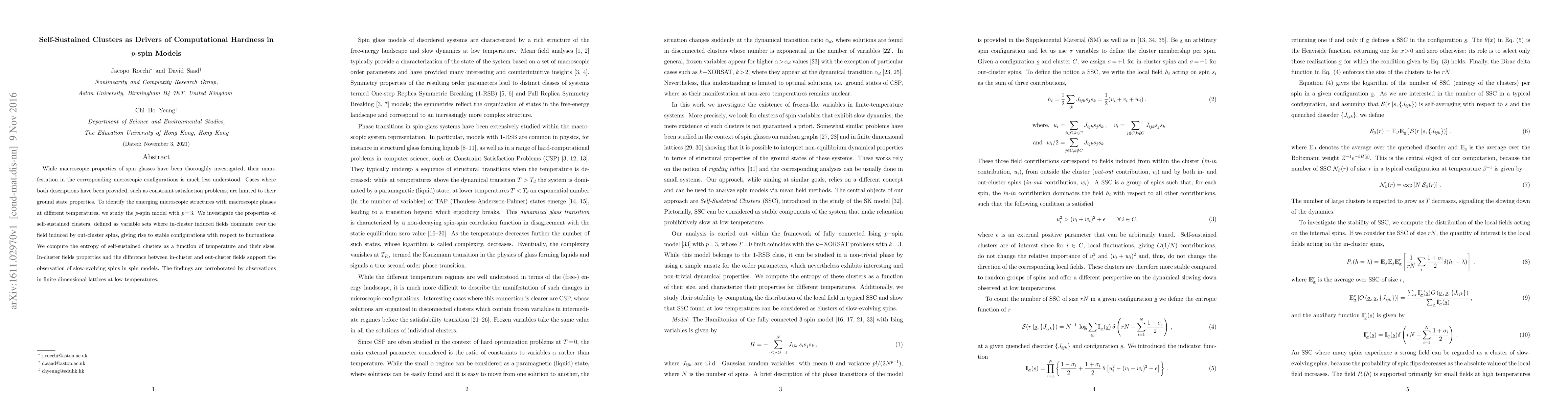 This paper investigates the microscopic structures in the $p$-spin model, specifically focusing on self-sustained clusters that dominate over external influences. The study reveals that these clusters contribute to the computational hardness of the model, with their entropy and size varying with temperature, supporting the presence of slow-evolving spins.