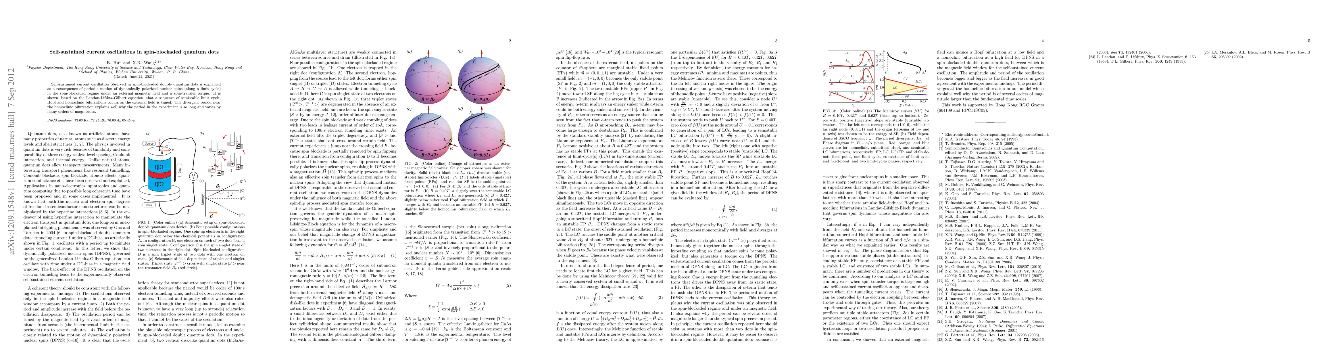 This paper explains self-sustained current oscillations in spin-blockaded double quantum dots through the periodic motion of dynamically polarized nuclear spins. The study reveals a sequence of bifurcations leading to long and variable oscillation periods, explained by the Landau-Lifshitz-Gilbert equation.