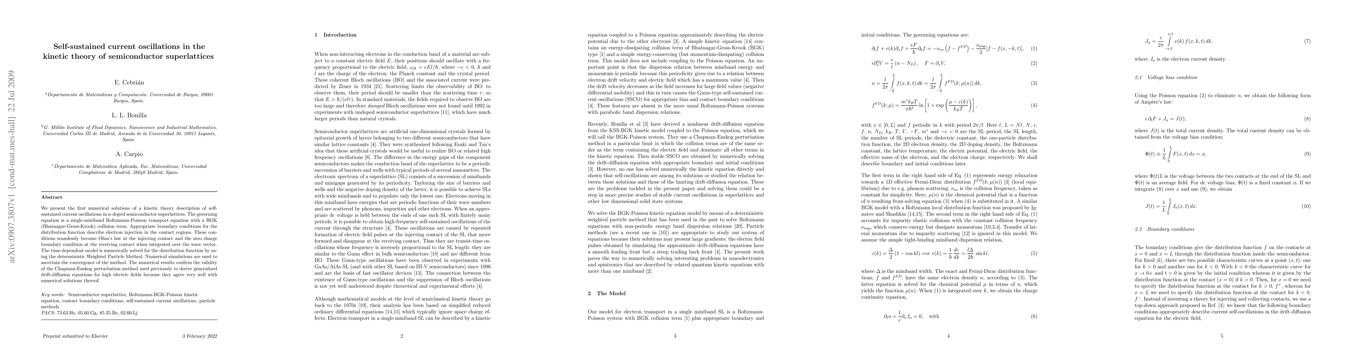 This research presents numerical solutions for self-sustained current oscillations in n-doped semiconductor superlattices using a kinetic theory approach. The study employs a Boltzmann-Poisson transport equation with a BGK collision term, solved using the Weighted Particle Method, validating previous derivations of generalized drift-diffusion equations.