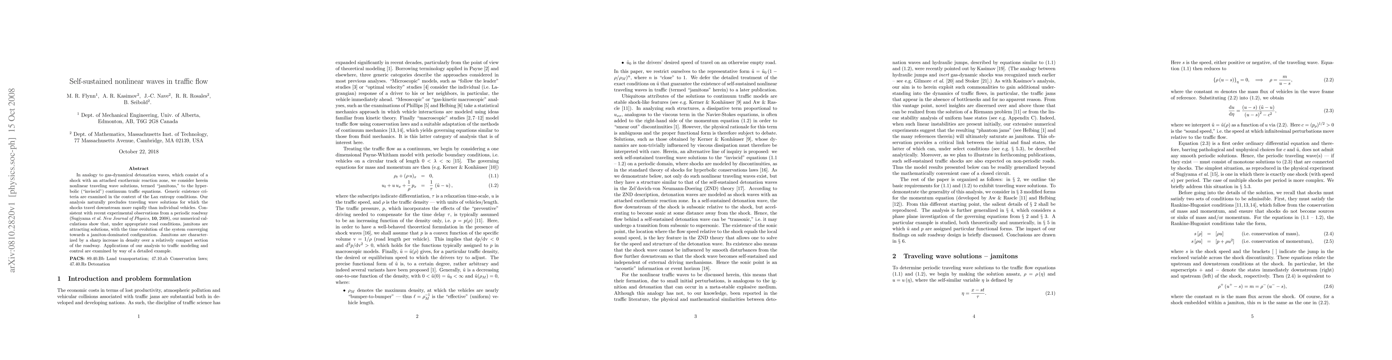 The research utilizes the Lax entropy conditions for hyperbolic conservation laws to analyze nonlinear traveling wave solutions, termed 'jamitons', in traffic flow, analogous to gas-dynamical detonation waves.
