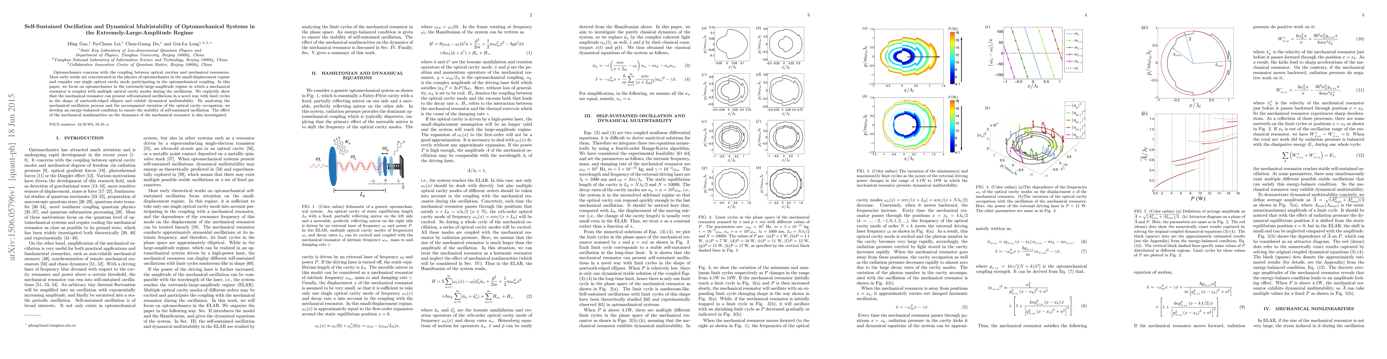Optomechanics concerns with the coupling between optical cavities and mechanical resonators. Most early works are concentrated in the physics of optomechanics in the small-displacement regime and consider one single optical cavity mode participating in the optomechanical coupling. In this paper, we focus on optomechanics in the extremely-large-amplitude regime in which a mechanical resonator is coupled with multiple optical cavity modes during the oscillation. We explicitly show that the mechanical resonator can present self-sustained oscillations in a novel way with limit cycles in the shape of sawtooth-edged ellipses and exhibit dynamical multistability. By analyzing the mechanical oscillation process and the accompanied variation of the optical cavity occupation, we develop an energy-balanced condition to ensure the stability of self-sustained oscillation. The effect of the mechanical nonlinearities on the dynamics of the mechanical resonator is also investigated.