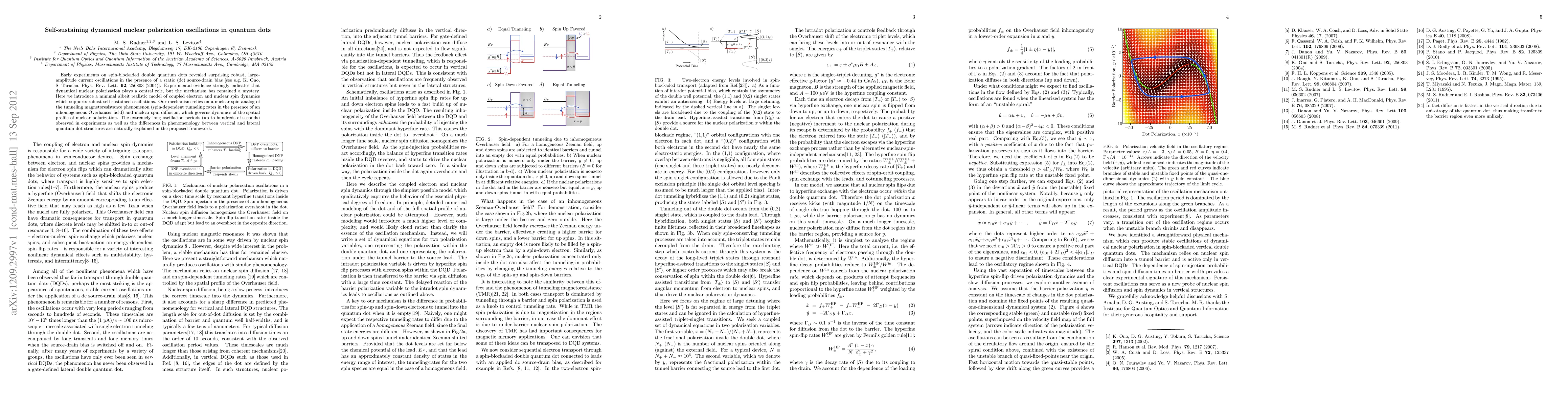 This paper proposes a model explaining the self-sustaining oscillations in quantum dots through dynamical nuclear polarization, attributing the phenomenon to nuclear-spin analog tunneling magnetoresistance and nuclear spin diffusion. The model accounts for long oscillation periods and differences in behavior between vertical and lateral quantum dot structures.