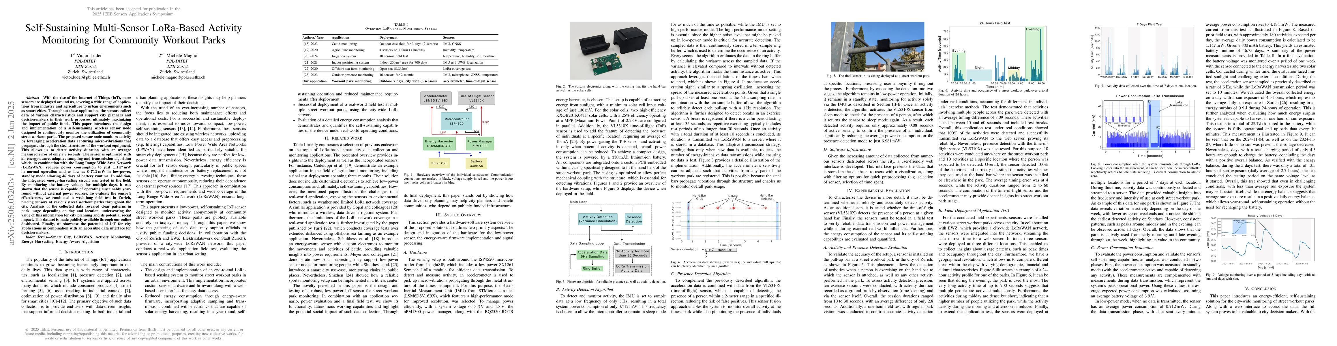This research presents a self-sustaining wireless sensor node for monitoring community street workout park usage. Utilizing acceleration data, it accurately detects activity duration with minimal error. The energy-efficient design, combining adaptive sampling, LoRaWAN, and energy harvesting, allows for extended battery life, enabling year-round operation without external power. Field tests in Zurich demonstrated clear usage patterns, with data made publicly accessible via an online dashboard, showcasing IoT's potential for urban applications.