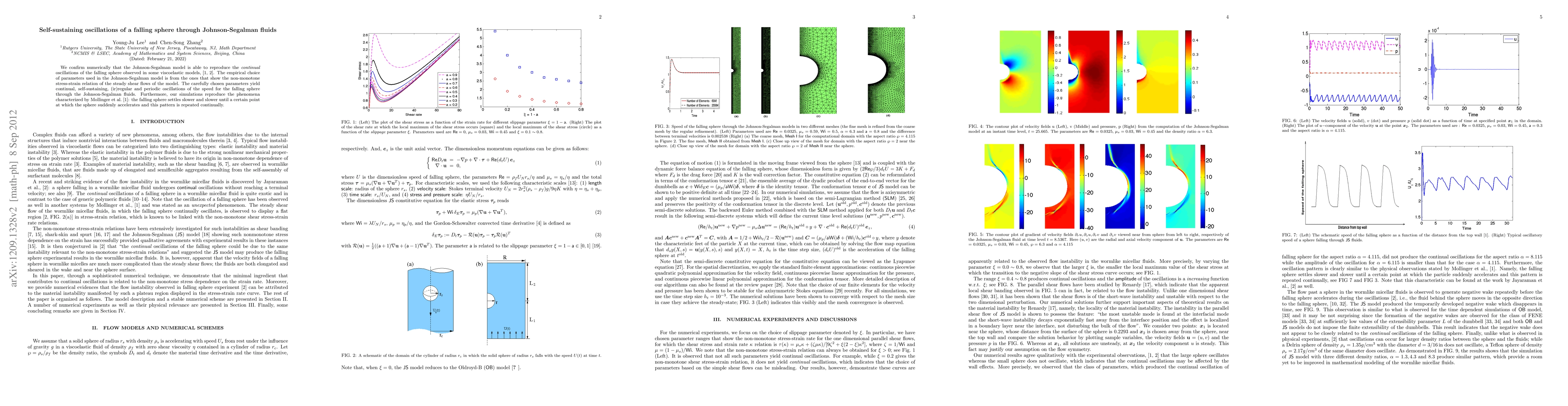 This paper numerically confirms that the Johnson-Segalman model can replicate the continual oscillations of a falling sphere in viscoelastic fluids, demonstrating self-sustaining, irregular, and periodic speed variations. The study uses empirical parameters to achieve a non-monotone stress-strain relation, accurately reproducing the sphere's slowing and sudden acceleration pattern.