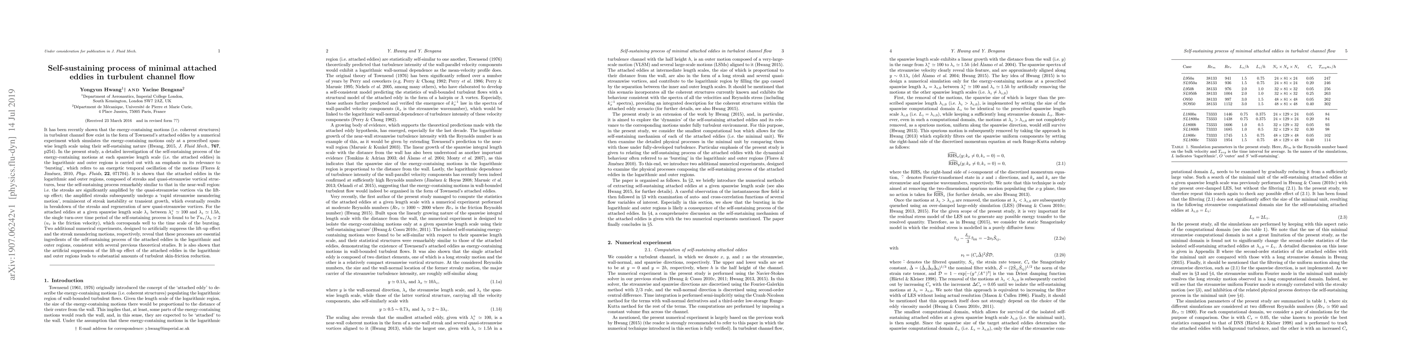 This study investigates the self-sustaining process of attached eddies in turbulent channel flow, showing that streaks are amplified by quasi-streamwise vortices via the lift-up effect, leading to streak breakdown and regeneration of new vortices. The findings highlight the essential role of these processes in the logarithmic and outer regions, consistent with previous theoretical studies.