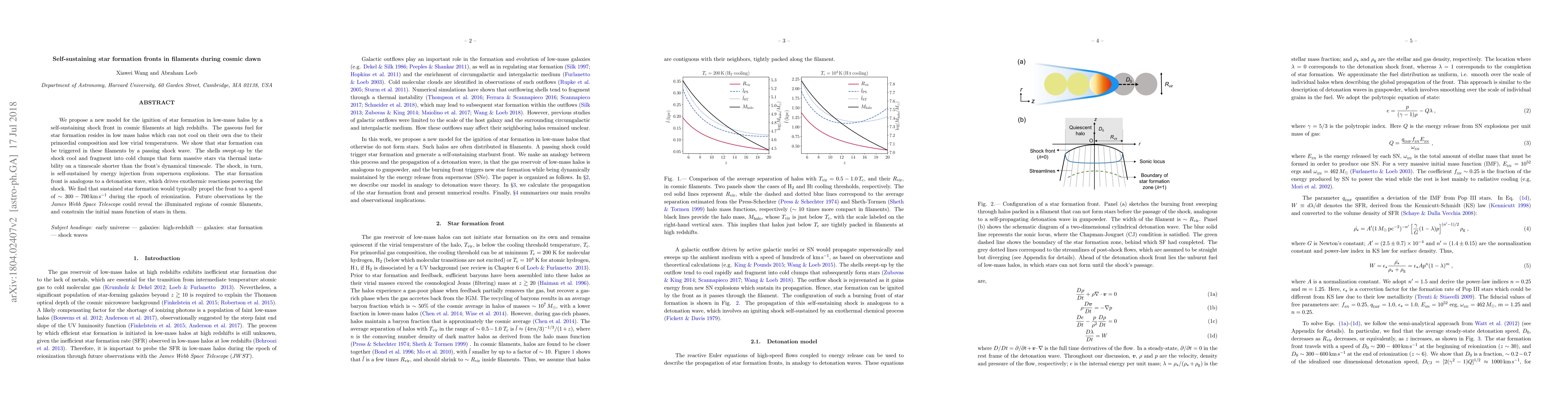 This paper proposes a model for self-sustaining star formation in low-mass halos via shock fronts in cosmic filaments during the cosmic dawn, driven by supernova explosions. Future observations by the James Webb Space Telescope may reveal these filaments and constrain star formation rates.