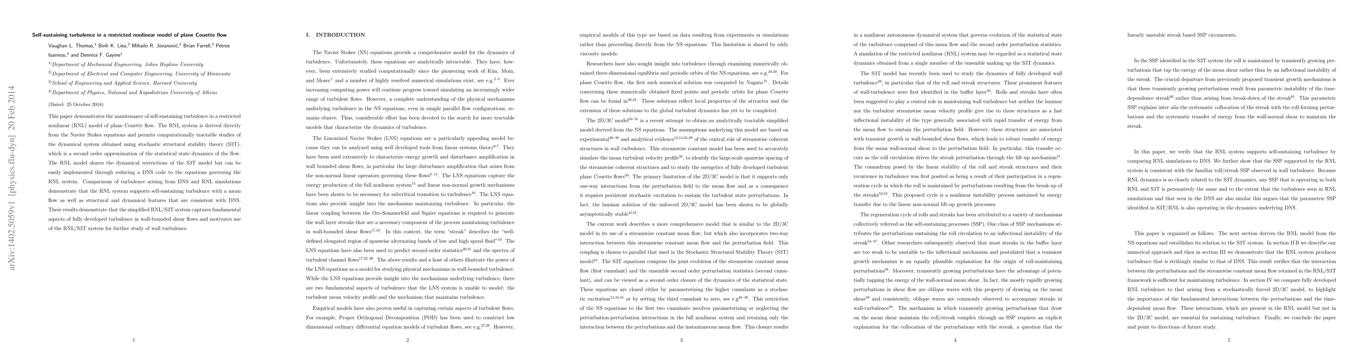 This paper presents a restricted nonlinear model of plane Couette flow that maintains self-sustaining turbulence, validated through comparisons with direct numerical simulations (DNS). The model, derived from the Navier-Stokes equations, uses stochastic structural stability theory for computational tractability and captures fundamental aspects of turbulence in wall-bounded shear flows.