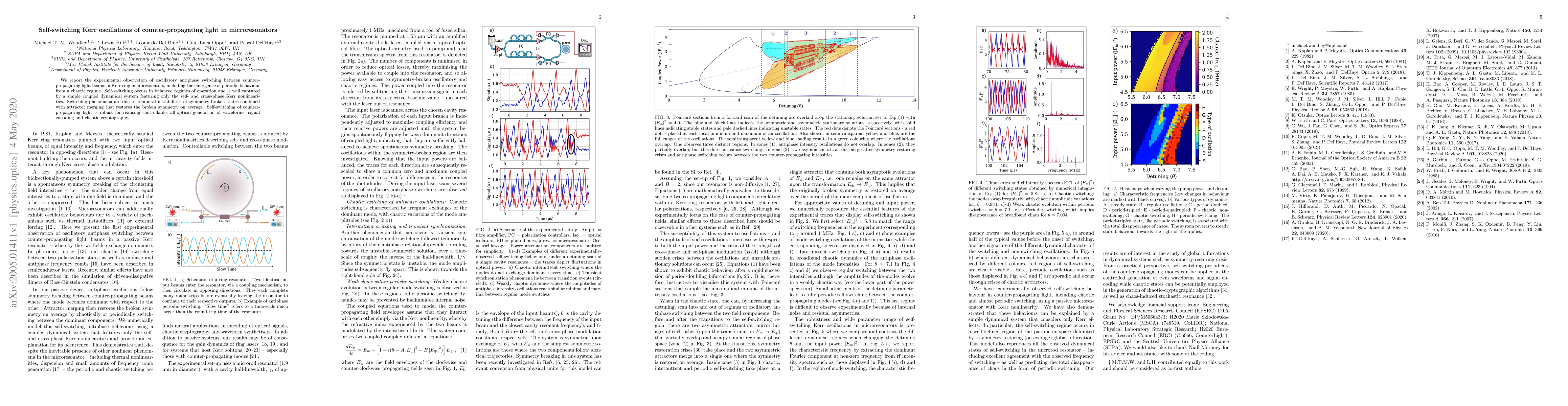 The paper reports the experimental observation of self-switching Kerr oscillations in microresonators, where counter-propagating light beams oscillate antiphase, transitioning from chaos to periodic behavior. This phenomenon is useful for generating controllable optical waveforms, signal encoding, and chaotic cryptography.