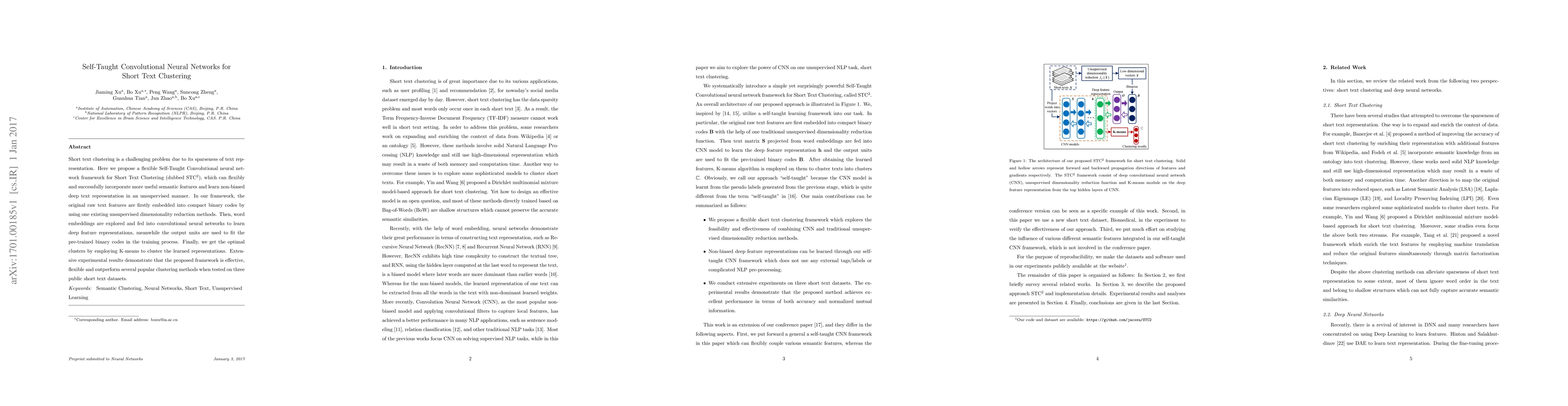 The paper proposes STC^2, a self-taught convolutional neural network framework for short text clustering, which leverages unsupervised dimensionality reduction and convolutional neural networks to extract deep, non-biased text representations, achieving superior clustering performance compared to other methods. The framework combines binary code embedding and word embeddings to learn optimal clusters via K-means.