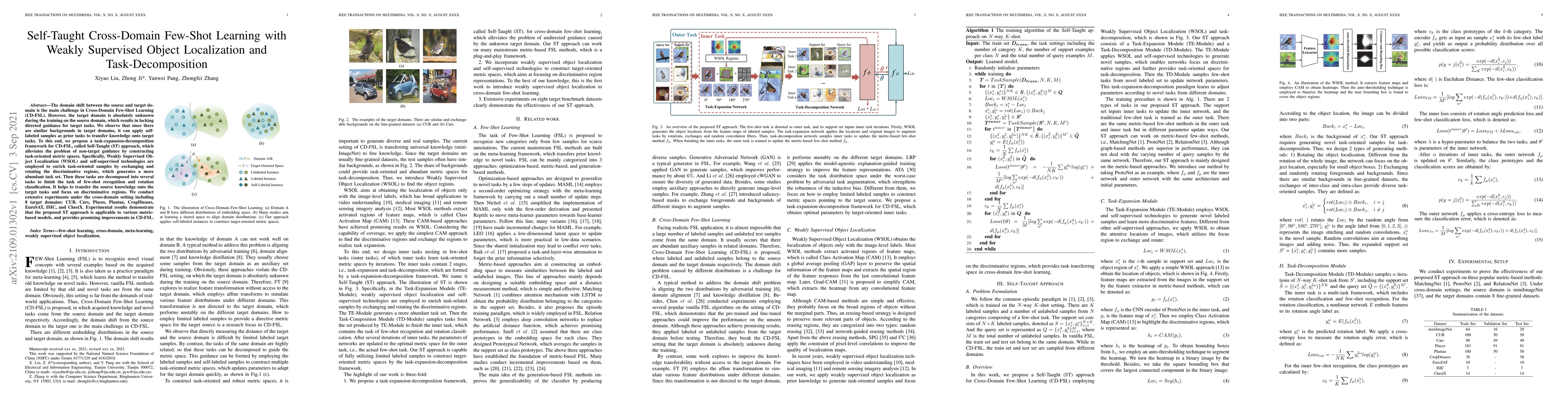 This paper proposes a self-taught approach for Cross-Domain Few-Shot Learning (CD-FSL) that leverages weakly supervised object localization and task decomposition to address the domain shift challenge. The method generates enriched task-oriented samples and decomposes them to improve few-shot recognition and rotation classification across various target domains.