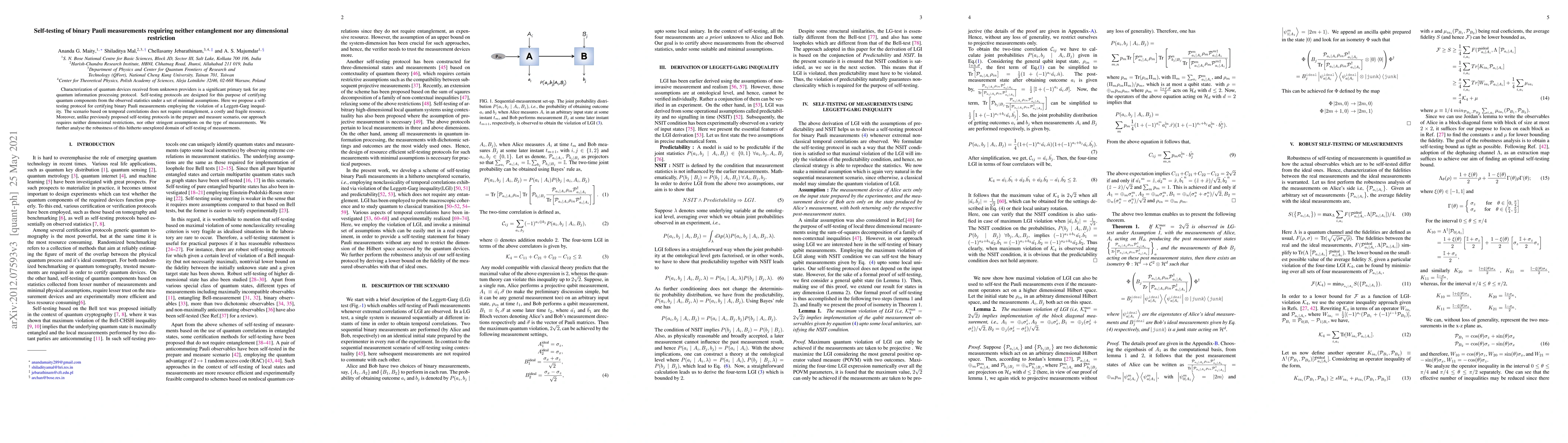Characterization of quantum devices received from unknown providers is a significant primary task for any quantum information processing protocol. Self-testing protocols are designed for this purpose of certifying quantum components from the observed statistics under a set of minimal assumptions. Here we propose a self-testing protocol for certifying binary Pauli measurements employing the violation of a Leggett-Garg inequality. The scenario based on temporal correlations does not require entanglement, a costly and fragile resource. Moreover, unlike previously proposed self-testing protocols in the prepare and measure scenario, our approach requires neither dimensional restrictions, nor other stringent assumptions on the type of measurements. We further analyse the robustness of this hitherto unexplored domain of self-testing of measurements.