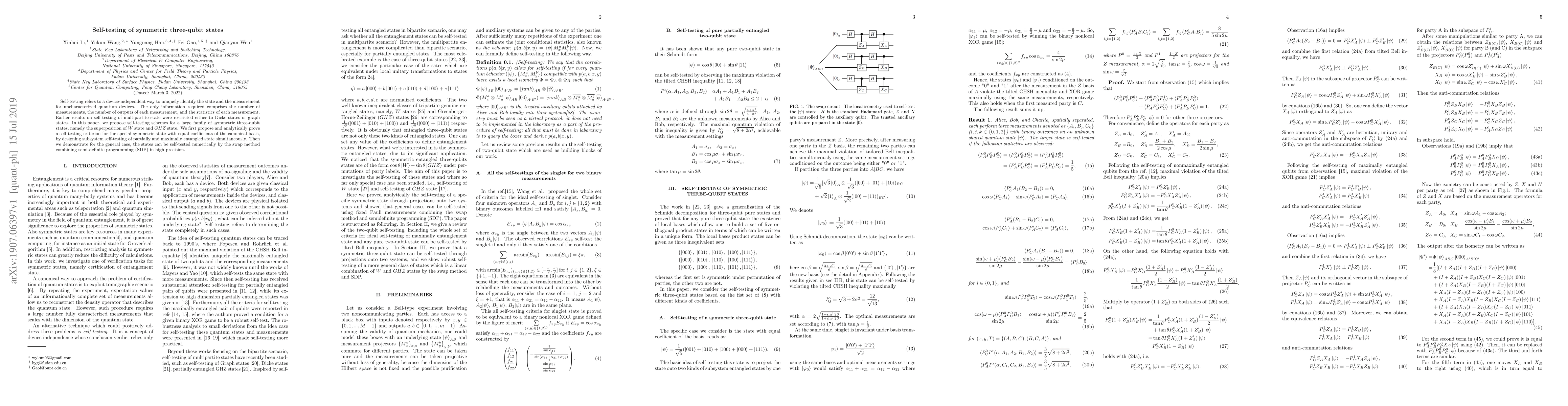 This paper proposes self-testing schemes for symmetric three-qubit states, specifically the superposition of W and GHZ states, using device-independent methods. The authors analytically prove a self-testing criterion for special symmetric states and demonstrate the general case through numerical methods combining the swap test and semi-definite programming.