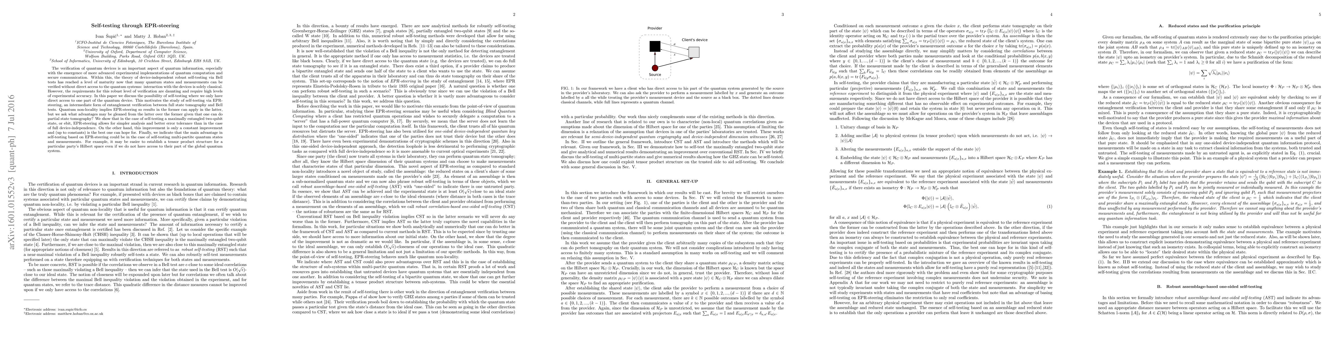 This paper explores self-testing via EPR-steering as a middle ground between full state tomography and Bell tests for quantum device verification. It demonstrates that EPR-steering offers simpler analysis and better error tolerance compared to device-independent methods, particularly for multi-partite quantum states.
