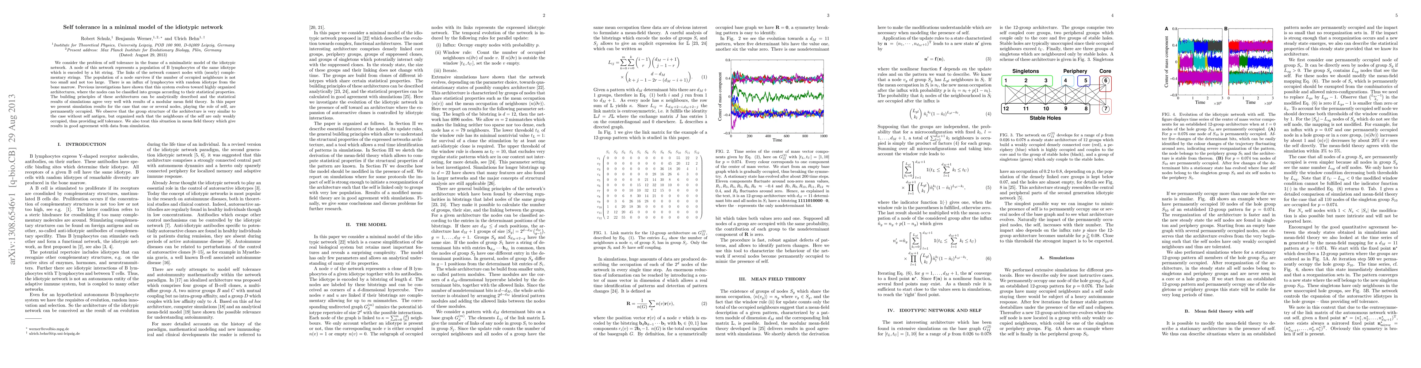We consider the problem of self tolerance in the frame of a minimalistic model of the idiotypic network. A node of this network represents a population of B lymphocytes of the same idiotype which is encoded by a bit string. The links of the network connect nodes with (nearly) complementary strings. The population of a node survives if the number of occupied neighbours is not too small and not too large. There is an influx of lymphocytes with random idiotype from the bone marrow. Previous investigations have shown that this system evolves toward highly organized architectures, where the nodes can be classified into groups according to their statistical properties. The building principles of these architectures can be analytically described and the statistical results of simulations agree very well with results of a modular mean field theory. In this paper we present simulation results for the case that one or several nodes, playing the role of self, are permanently occupied. We observe that the group structure of the architecture is very similar to the case without self antigen, but organized such that the neighbours of the self are only weakly occupied, thus providing self tolerance. We also treat this situation in mean field theory which give results in good agreement with data from simulation.