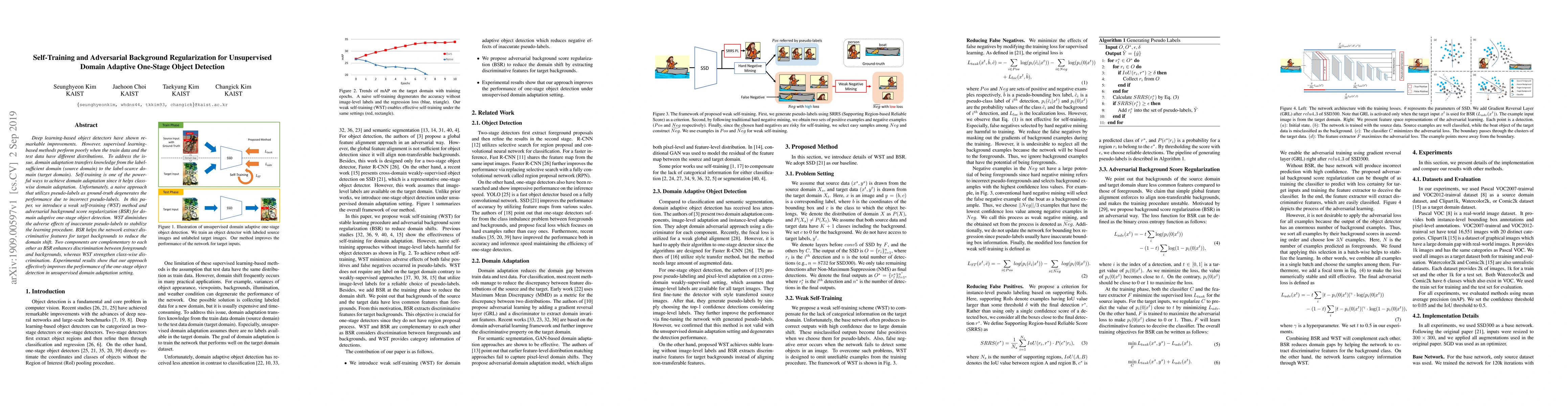 Deep learning-based object detectors have shown remarkable improvements. However, supervised learning-based methods perform poorly when the train data and the test data have different distributions. To address the issue, domain adaptation transfers knowledge from the label-sufficient domain (source domain) to the label-scarce domain (target domain). Self-training is one of the powerful ways to achieve domain adaptation since it helps class-wise domain adaptation. Unfortunately, a naive approach that utilizes pseudo-labels as ground-truth degenerates the performance due to incorrect pseudo-labels. In this paper, we introduce a weak self-training (WST) method and adversarial background score regularization (BSR) for domain adaptive one-stage object detection. WST diminishes the adverse effects of inaccurate pseudo-labels to stabilize the learning procedure. BSR helps the network extract discriminative features for target backgrounds to reduce the domain shift. Two components are complementary to each other as BSR enhances discrimination between foregrounds and backgrounds, whereas WST strengthen class-wise discrimination. Experimental results show that our approach effectively improves the performance of the one-stage object detection in unsupervised domain adaptation setting.