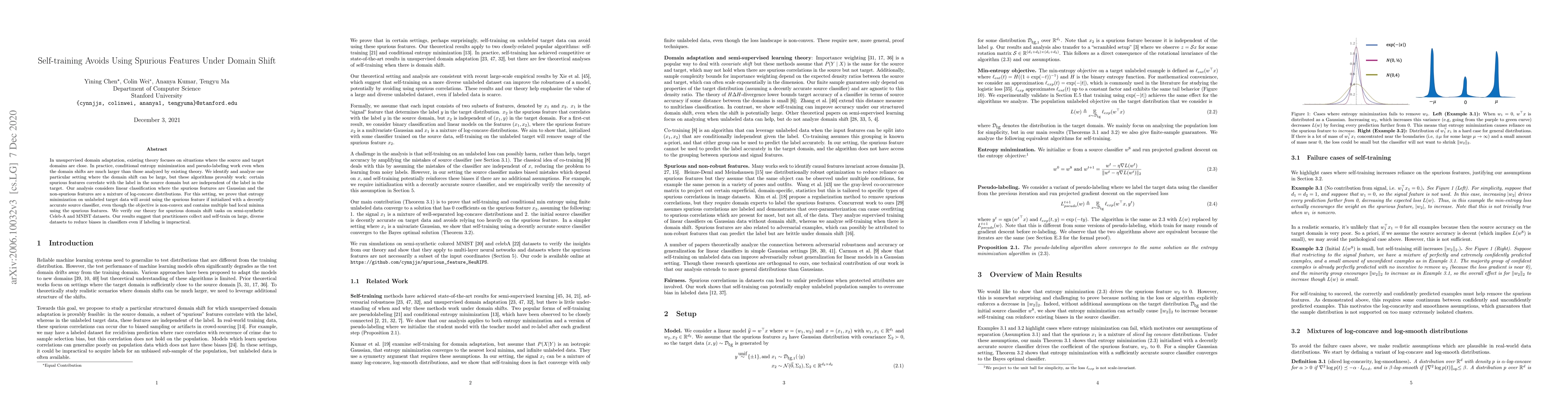 This paper demonstrates that self-training can effectively avoid using spurious features in unsupervised domain adaptation, even under significant domain shifts. It proves that entropy minimization on unlabeled target data can exclude spurious features when initialized with an accurate source classifier, validated through experiments on Celeb-A and MNIST datasets.