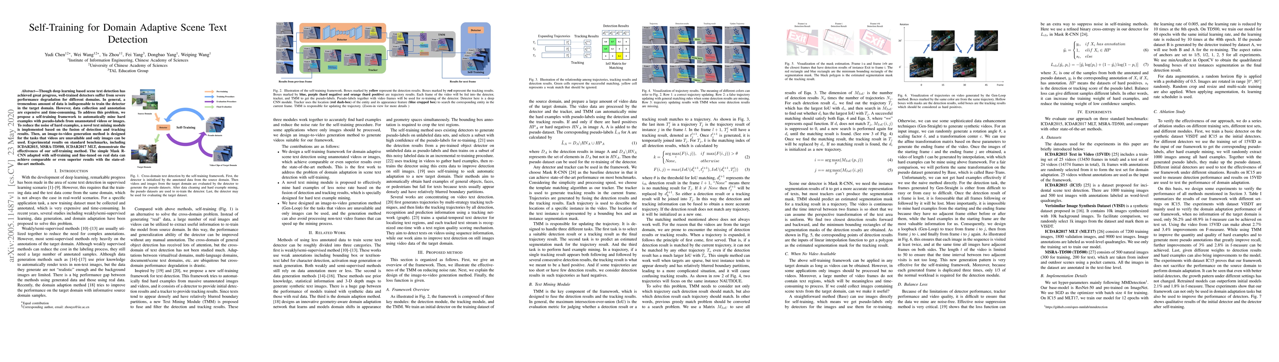 This paper proposes a self-training framework for domain adaptive scene text detection, leveraging unannotated videos or images to generate pseudo-labels for hard examples. The method includes a text mining module and an image-to-video generation technique to reduce noise and enhance performance, achieving competitive results on standard benchmarks.