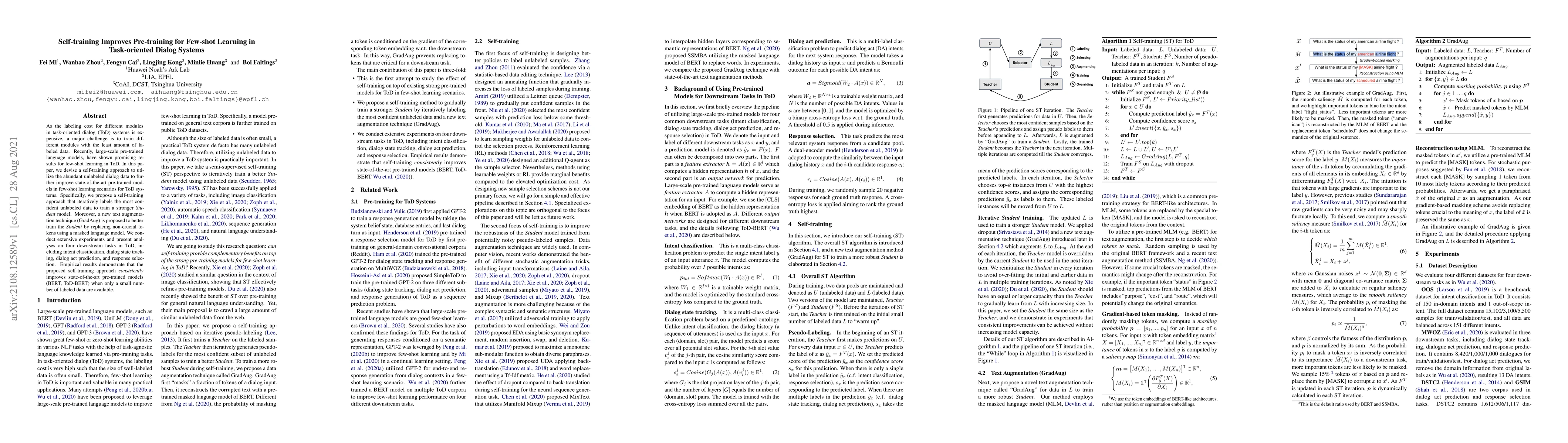 This paper proposes a self-training method to enhance pre-trained models for few-shot learning in task-oriented dialog systems using abundant unlabeled data. The approach iteratively labels confident unlabeled data and employs GradAug text augmentation to improve the Student model, achieving better performance on four ToD tasks.