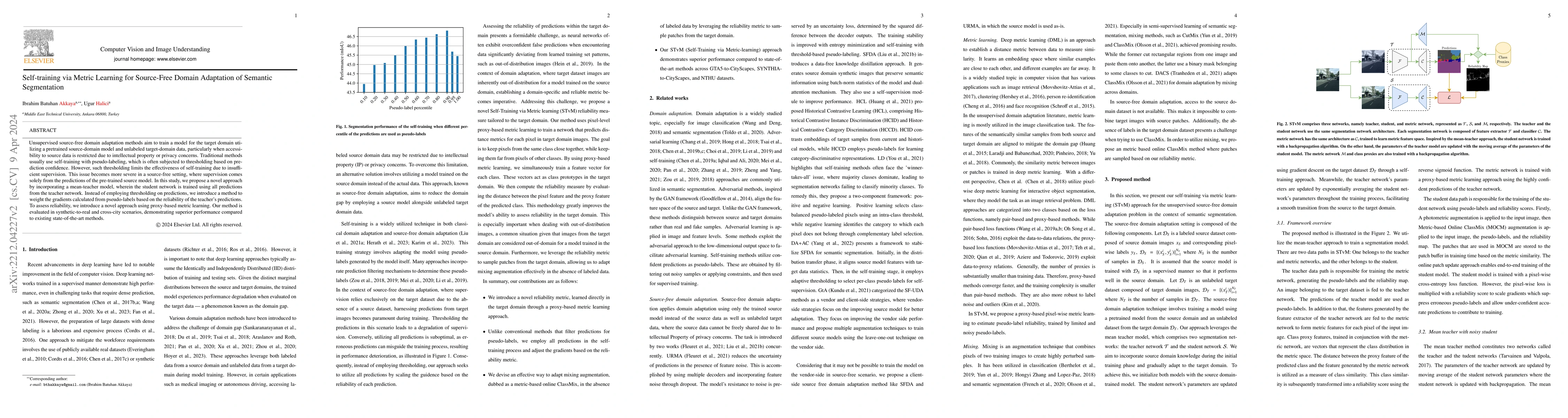 This paper proposes a self-training method for source-free domain adaptation in semantic segmentation, utilizing a mean-teacher model where the student network is trained on all teacher predictions. Instead of thresholding, it employs metric learning to weigh gradients based on prediction reliability, achieving superior performance over existing methods.