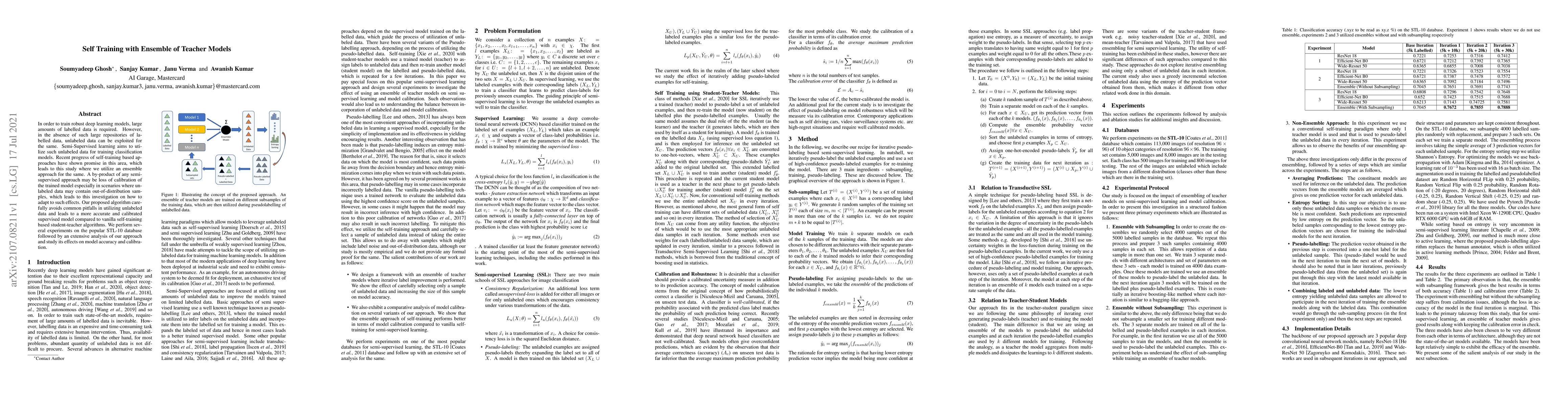 In order to train robust deep learning models, large amounts of labelled data is required. However, in the absence of such large repositories of labelled data, unlabeled data can be exploited for the same. Semi-Supervised learning aims to utilize such unlabeled data for training classification models. Recent progress of self-training based approaches have shown promise in this area, which leads to this study where we utilize an ensemble approach for the same. A by-product of any semi-supervised approach may be loss of calibration of the trained model especially in scenarios where unlabeled data may contain out-of-distribution samples, which leads to this investigation on how to adapt to such effects. Our proposed algorithm carefully avoids common pitfalls in utilizing unlabeled data and leads to a more accurate and calibrated supervised model compared to vanilla self-training based student-teacher algorithms. We perform several experiments on the popular STL-10 database followed by an extensive analysis of our approach and study its effects on model accuracy and calibration.