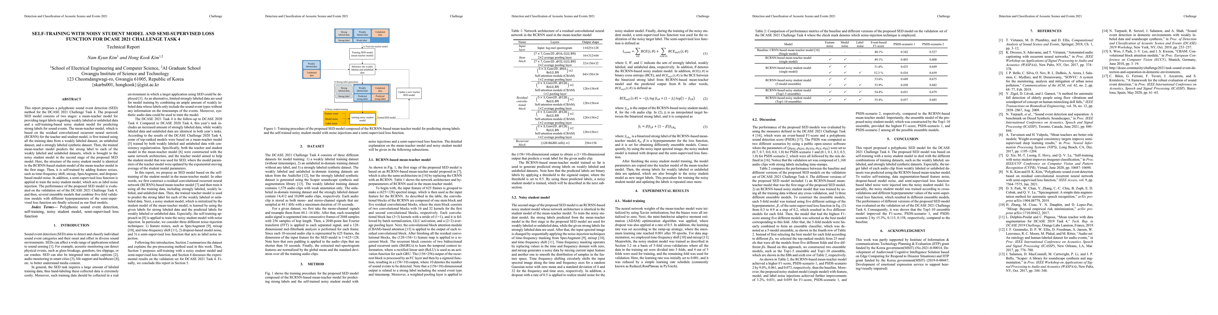 This report proposes a polyphonic sound event detection (SED) method for the DCASE 2021 Challenge Task 4. The proposed SED model consists of two stages: a mean-teacher model for providing target labels regarding weakly labeled or unlabeled data and a self-training-based noisy student model for predicting strong labels for sound events. The mean-teacher model, which is based on the residual convolutional recurrent neural network (RCRNN) for the teacher and student model, is first trained using all the training data from a weakly labeled dataset, an unlabeled dataset, and a strongly labeled synthetic dataset. Then, the trained mean-teacher model predicts the strong label to each of the weakly labeled and unlabeled datasets, which is brought to the noisy student model in the second stage of the proposed SED model. Here, the structure of the noisy student model is identical to the RCRNN-based student model of the mean-teacher model in the first stage. Then, it is self-trained by adding feature noises, such as time-frequency shift, mixup, SpecAugment, and dropout-based model noise. In addition, a semi-supervised loss function is applied to train the noisy student model, which acts as label noise injection. The performance of the proposed SED model is evaluated on the validation set of the DCASE 2021 Challenge Task 4, and then, several ensemble models that combine five-fold validation models with different hyperparameters of the semi-supervised loss function are finally selected as our final models.