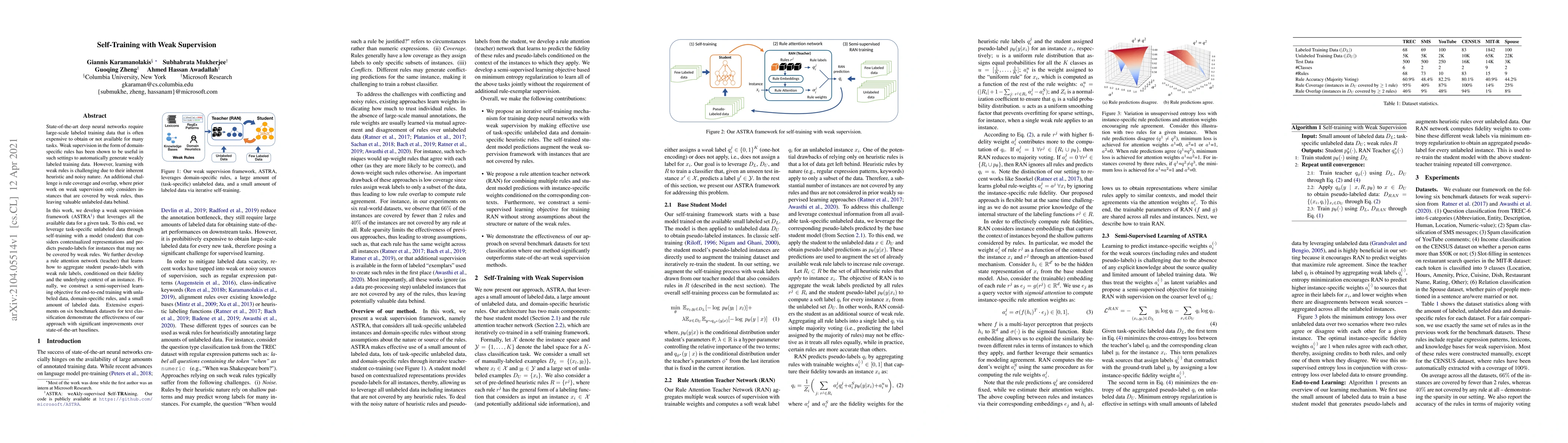 This paper introduces ASTRA, a framework for self-training with weak supervision that leverages all available data, including unlabeled instances, by using a student model to predict pseudo-labels and a teacher model to aggregate these with weak rule labels. Experiments show significant improvements over baselines on text classification tasks.
