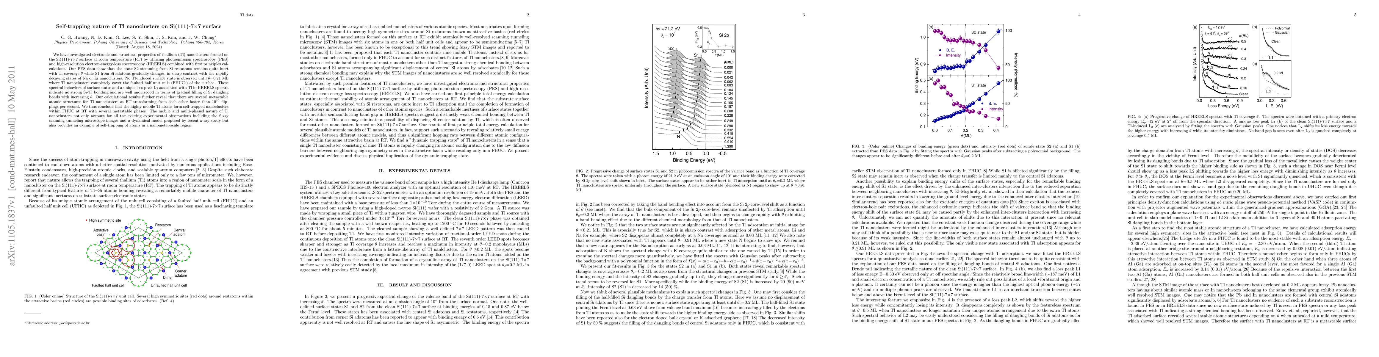 This study reveals that Tl nanoclusters on Si(111)-7×7 surface exhibit a self-trapping nature with high mobility and multiple metastable phases, as evidenced by inert surface states and no strong Si-Tl bonding, based on PES, HREELS, and first-principles calculations. The nanoclusters fill Si dangling bonds gradually without inducing new surface states until full coverage.