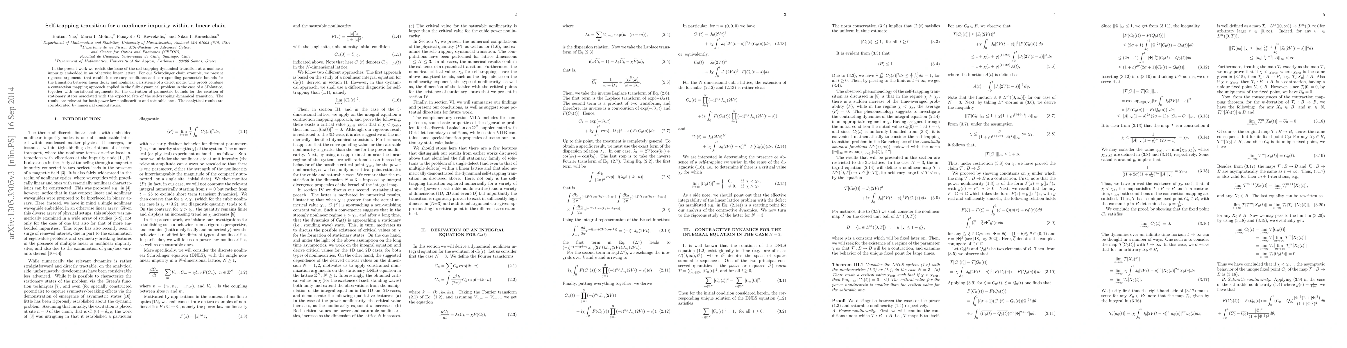 In the present work we revisit the issue of the self-trapping dynamical transition at a nonlinear impurity embedded in an otherwise linear lattice. For our Schr\"odinger chain example, we present rigorous arguments that establish necessary conditions and corresponding parametric bounds for the transition between linear decay and nonlinear persistence of a defect mode. The proofs combine a contraction mapping approach applied in the fully dynamical problem in the case of a 3D-lattice, together with variational arguments for the derivation of parametric bounds for the creation of stationary states associated with the expected fate of the self-trapping dynamical transition. The results are relevant for both power law nonlinearities and saturable ones. The analytical results are corroborated by numerical computations.