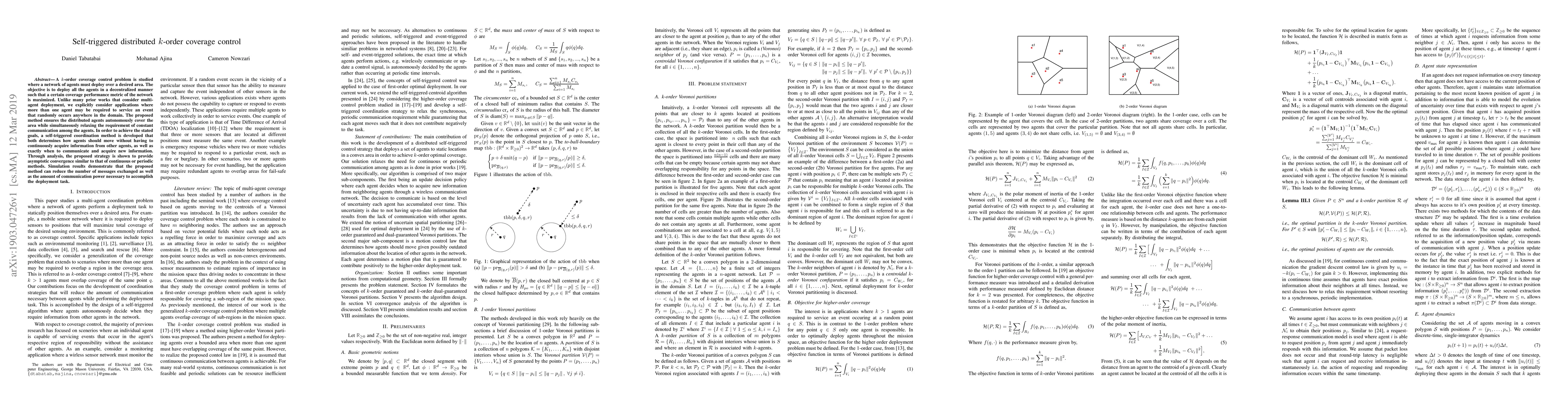 This paper proposes a self-triggered distributed k-order coverage control method for a network of agents to autonomously cover a desired area without constant communication. The method ensures efficient deployment while minimizing communication power and message exchanges.