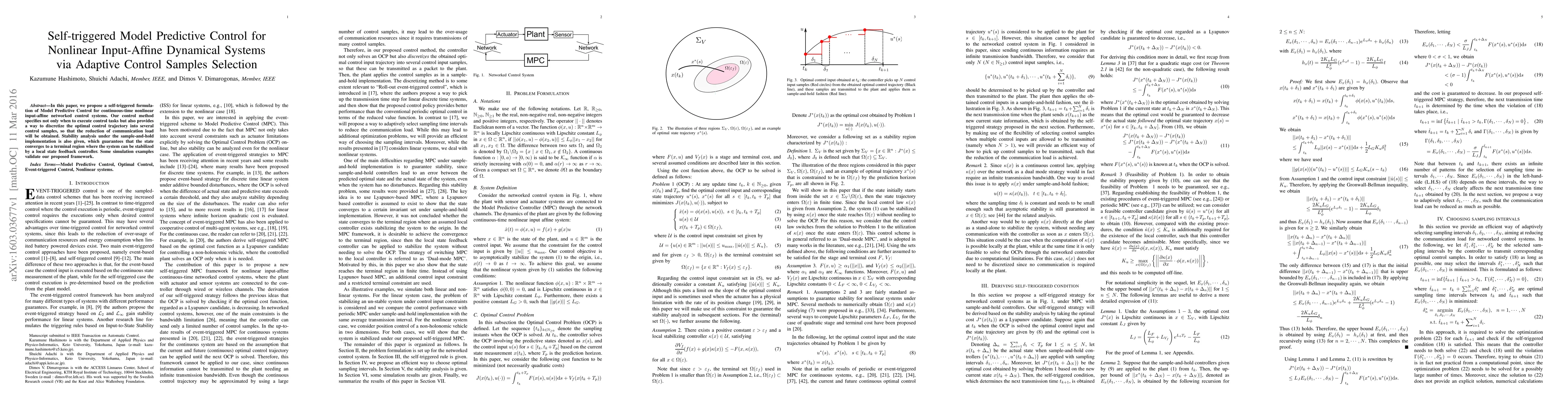 This paper proposes a self-triggered Model Predictive Control method for continuous-time nonlinear input-affine systems, optimizing communication load by adaptively selecting control samples. Stability is ensured under sample-and-hold implementation, with simulations validating the effectiveness of the approach.