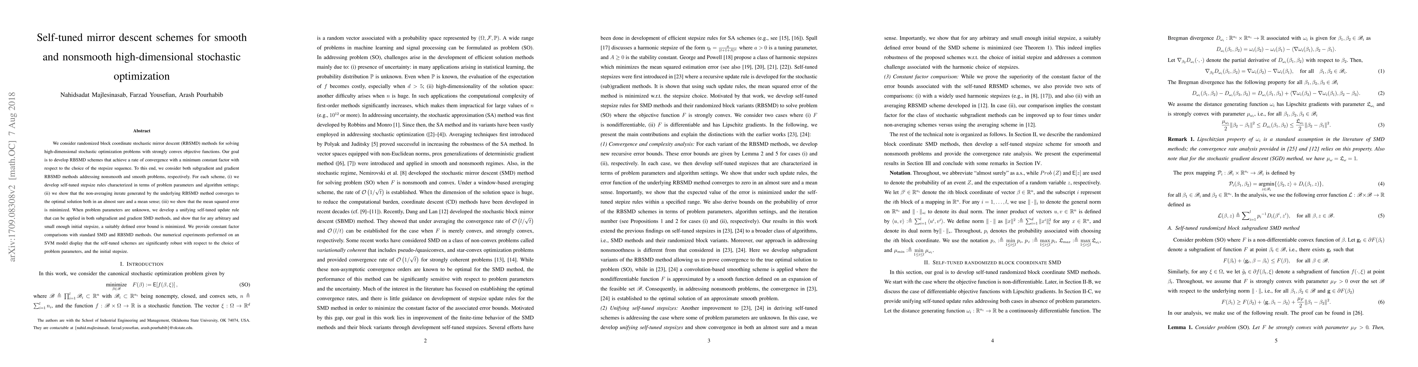 This paper develops self-tuned randomized block coordinate stochastic mirror descent (RBSMD) methods for high-dimensional stochastic optimization, achieving optimal convergence rates with adaptive stepsize rules. The proposed schemes minimize mean squared error and demonstrate robustness in numerical experiments on SVM models.