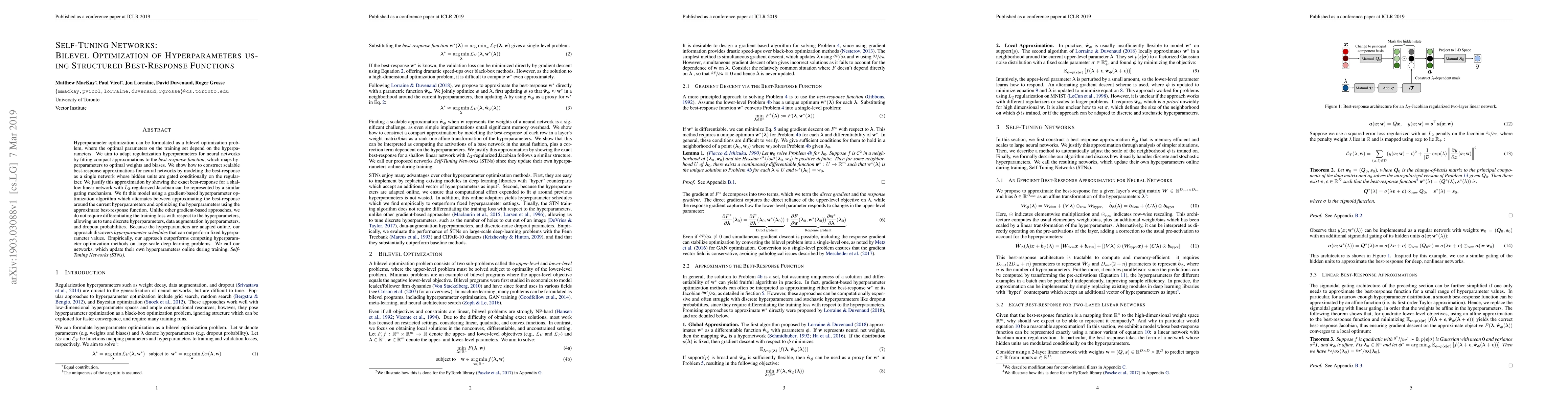 This paper proposes Self-Tuning Networks (STNs) that use bilevel optimization to adapt regularization hyperparameters by fitting compact approximations to best-response functions. The approach outperforms traditional methods in large-scale deep learning tasks by dynamically tuning hyperparameters without requiring differentiation of the training loss with respect to them.
