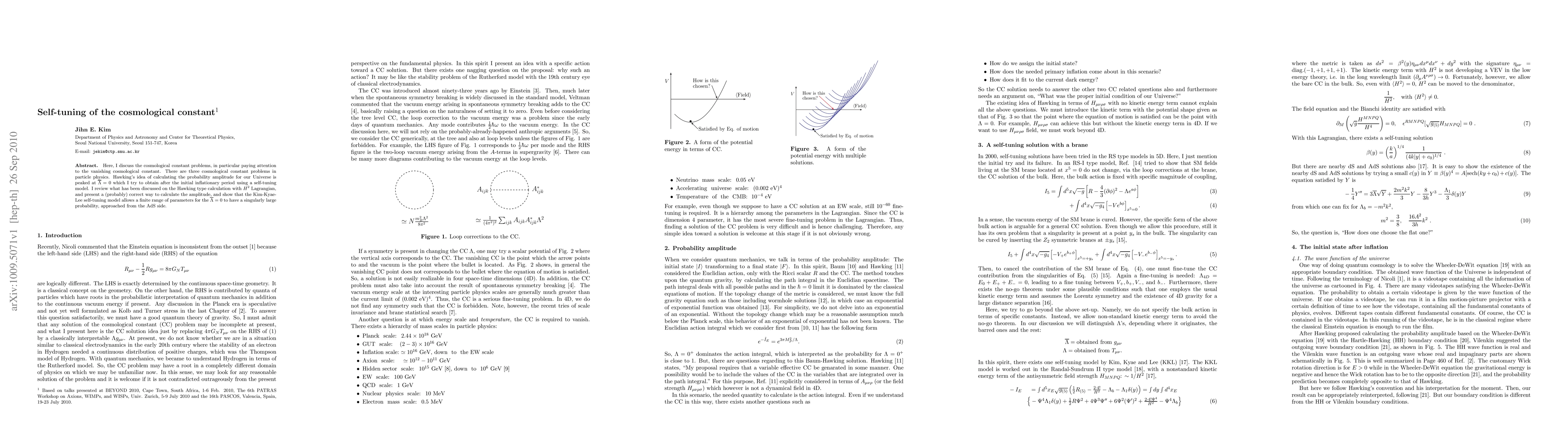 Here, I discuss the cosmological constant (CC) problems, in particular paying attention to the vanishing cosmological constant. There are three cosmological constant problems in particle physics. Hawking's idea of calculating the probability amplitude for our Universe is peaked at CC = 0 which I try to obtain after the initial inflationary period using a self-tuning model. I review what has been discussed on the Hawking type calculation, and present a (probably) correct way to calculate the amplitude, and show that the Kim-Kyae-Lee self-tuning model allows a finite range of parameters for the CC = 0 to have a singularly large probability, approached from the AdS side.