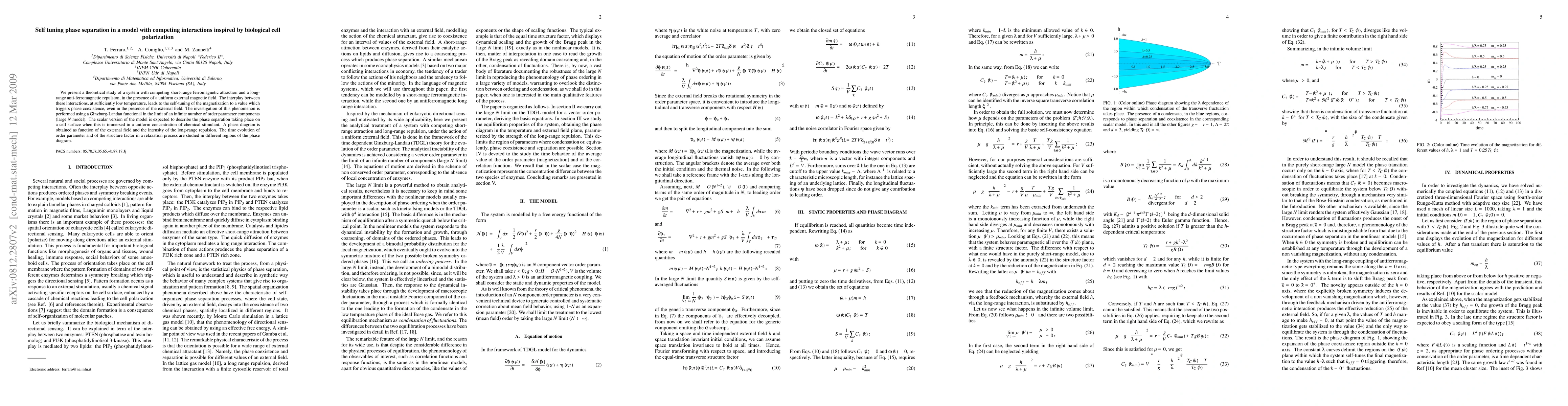 We present a theoretical study of a system with competing short-range ferromagnetic attraction and a long-range anti-ferromagnetic repulsion, in the presence of a uniform external magnetic field. The interplay between these interactions, at sufficiently low temperature, leads to the self-tuning of the magnetization to a value which triggers phase coexistence, even in the presence of the external field. The investigation of this phenomenon is performed using a Ginzburg-Landau functional in the limit of an infinite number of order parameter components (large $N$ model). The scalar version of the model is expected to describe the phase separation taking place on a cell surface when this is immersed in a uniform concentration of chemical stimulant. A phase diagram is obtained as function of the external field and the intensity of the long-range repulsion. The time evolution of order parameter and of the structure factor in a relaxation process are studied in different regions of the phase diagram.
