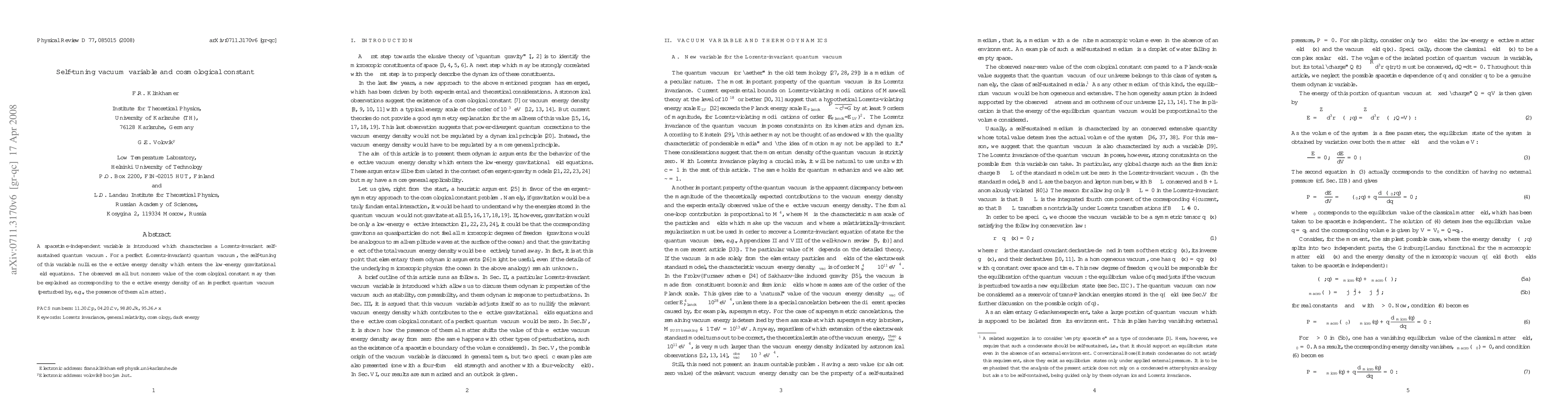 A spacetime-independent variable is introduced which characterizes a Lorentz-invariant self-sustained quantum vacuum. For a perfect (Lorentz-invariant) quantum vacuum, the self-tuning of this variable nullifies the effective energy density which enters the low-energy gravitational field equations. The observed small but nonzero value of the cosmological constant may then be explained as corresponding to the effective energy density of an imperfect quantum vacuum (perturbed by, e.g., the presence of thermal matter).